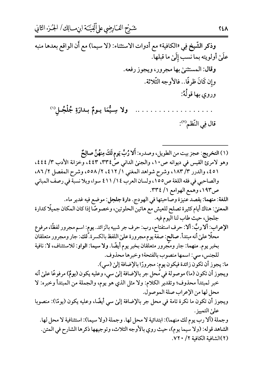 وذكر الشّيخ فِي "الكافية" مع أدوات الاستثناء: (لا سيما) مع أَن الواقع بعدها منبه علَى أولويته بما نسب إِلَى ما قبلها.