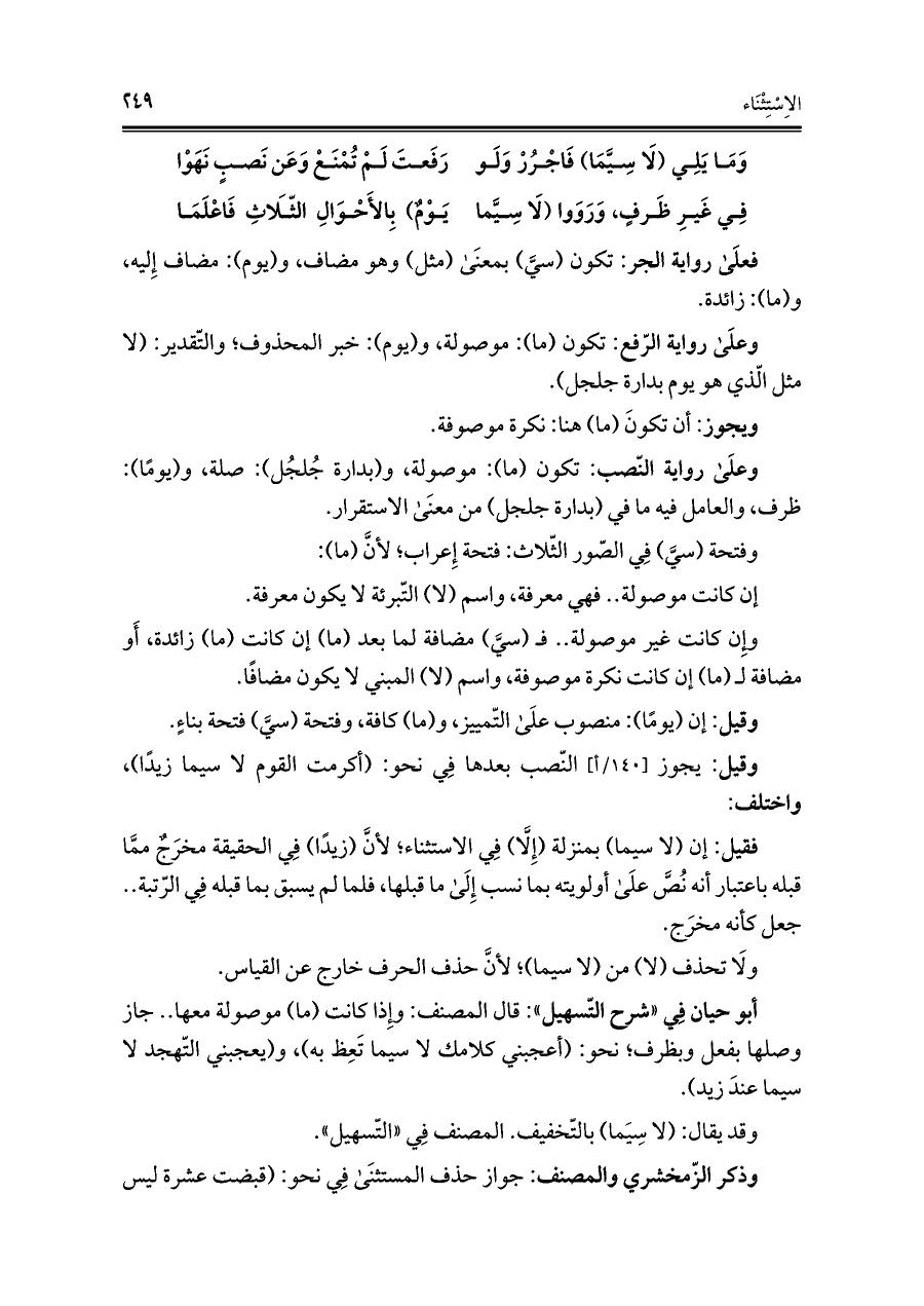 فقيل: إن (لا سيما) بمنزلة (إِلَّا) فِي الاستثناء؛ لأنَّ (زيدًا) فِي الحقيقة مخرَجٌ ممَّا قبله باعتبار أنه نُصَّ علَى أولويته بما نسب إِلَى ما قبلها، فلما لم يسبق بما قبله فِي الرّتبة .. جعل كأنه مخرَج.