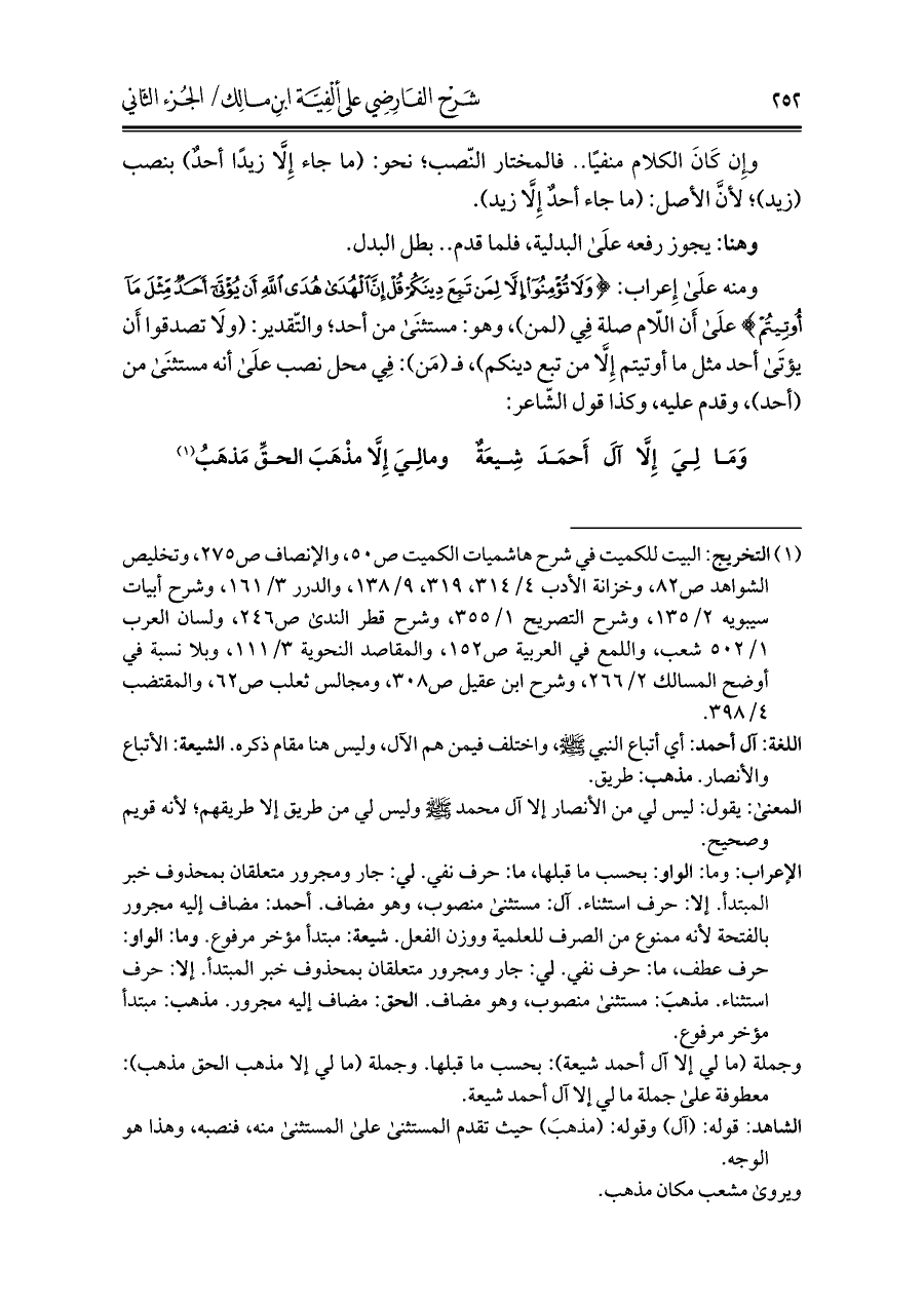 الإعراب: وما: الواو: بحسب ما قبلها، ما: حرف نفي. لي: جار ومجرور متعلقان بمحذوف خبر المبتدأ. إلا: حرف استثناء. آل: مستثنى منصوب، وهو مضاف. أحمد: مضاف إليه مجرور بالفتحة لأنه ممنوع من الصرف للعلمية ووزن الفعل. شيعة: مبتدأ مؤخر مرفوع: وما: الواو: حرف عطف، ما: حرف نفي. لي: جار ومجرور متعلقان بمحذوف خبر المبتدأ: إلا: حرف استثناء. مذهب: مستثنى منصوب، وهو مضاف. الحق: مضاف إليه مجرور. مذهب: مبتدأ مؤخر مرفوع.