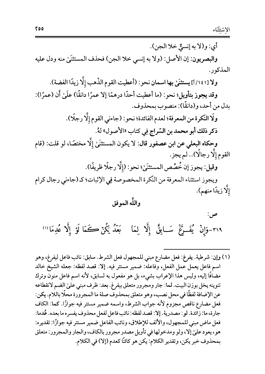 ٣١٩ - وَإنْ يُفَرَّغْ سَابِقٌ إلَّا لِمَا ... بَعْدُ يَكُنْ كَمَا لَوْ إلَّا عُدِمَا (¬١)