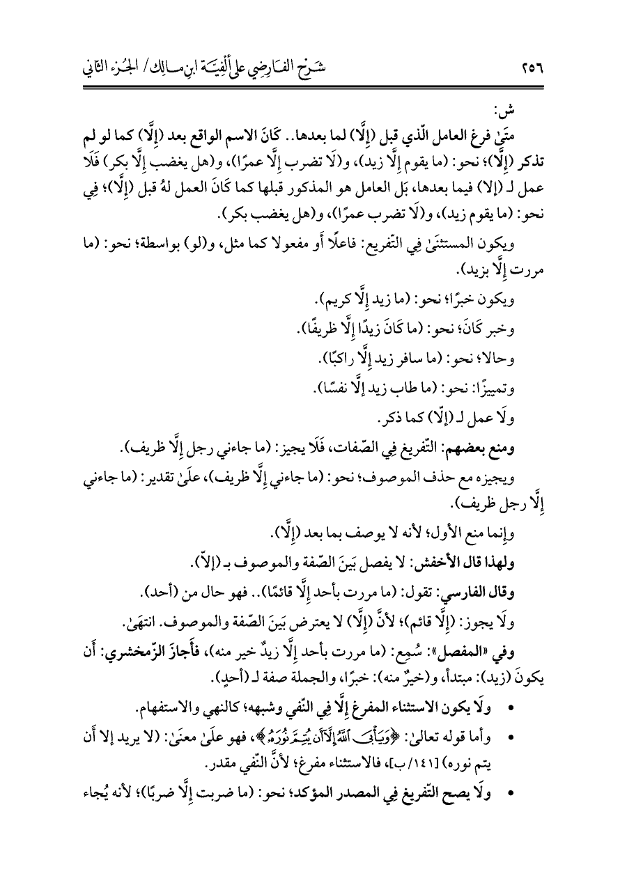 • ولَا يكون الاستثناء المفرغ إِلَّا فِي النّفي وشبهه؛ كالنهي والاستفهام.