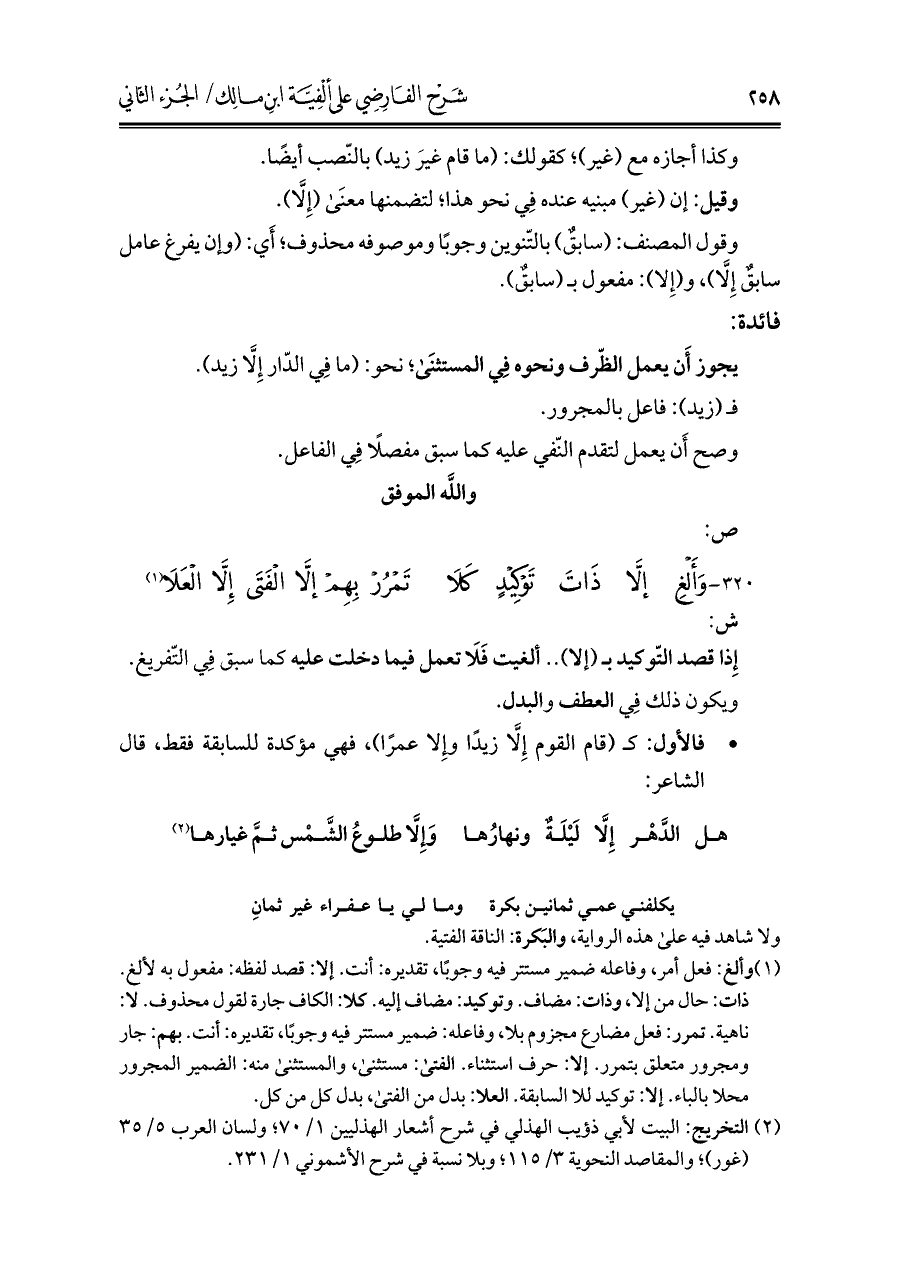 ٣٢٠ - وَأَلْغِ إلَّا ذَاتَ تَوْكِيدٍ كَلَا ... تَمْرُرْ بِهِمْ إلَّا الفَتَى إلَّا العَلَا (¬١)