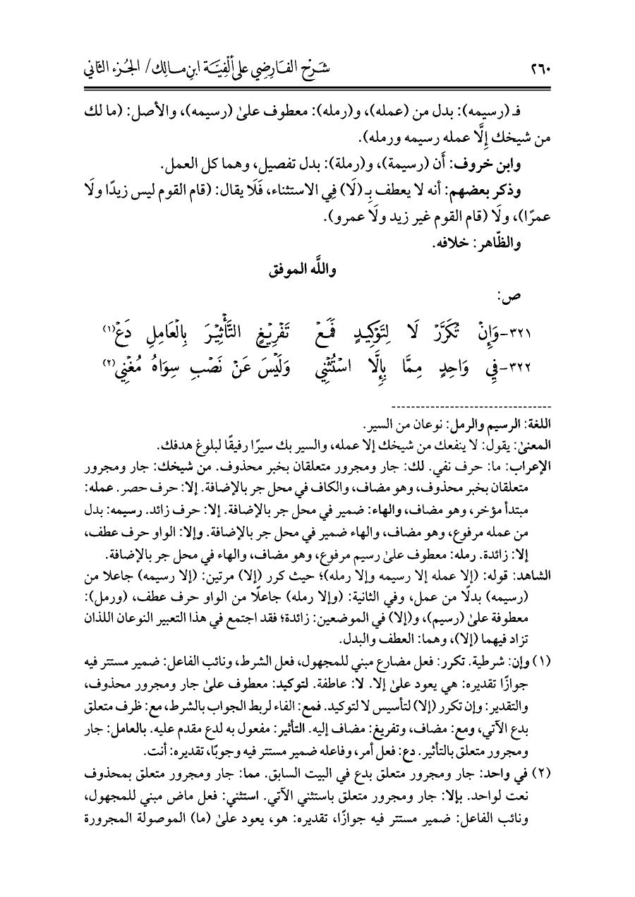(¬١) وإن: شرطية. تكرر: فعل مضارع مبني للمجهول، فعل الشرط، ونائب الفاعل: ضمير مستتر فيه جوازًا تقديره: هي يعود على إلا. لا: عاطفة: لتوكيد: معطوف على جار ومجرور محذوف، والتقدير: وإن تكرر (إلا) لتأسيس لا لتوكيد. فمع: الفاء لربط الجواب بالشرط، مع: ظرف متعلق بدع الآتي، ومع: مضاف، وتفريغ: مضاف إليه: التأثير: مفعول به لدع مقدم عليه. بالعامل: جار ومجرور متعلق بالتأثير. دع: فعل أمر، وفاعله ضمير مستتر فيه وجوبًا، تقديره: أنت.