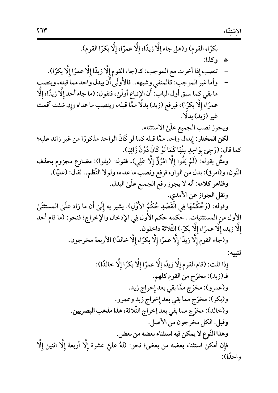 - وأما غير الموجب: كالمنفى وشبهه .. فالأَولَى أَن يبدل واحد مما قبله، وينصب ما بقي كما سبق أول الباب: أَن الإتباع أولَى، فتقول: (ما جاء أحد إِلَّا زيدًا، إِلَّا عمرًا، إِلَّا بكرًا)، فيرفع (زيد) بدلًا ممَّا قبله، وينصب ما عداه وإِن شئت أقمت غير (زيد) بدلًا.