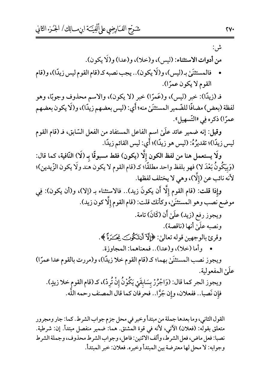 • فالمستثنَى بـ (ليس)، و (لَا يكون) .. يجب نصبه كـ (قام القوم ليس زيدًا)، و (قام القوم لا يكون عمرًا).