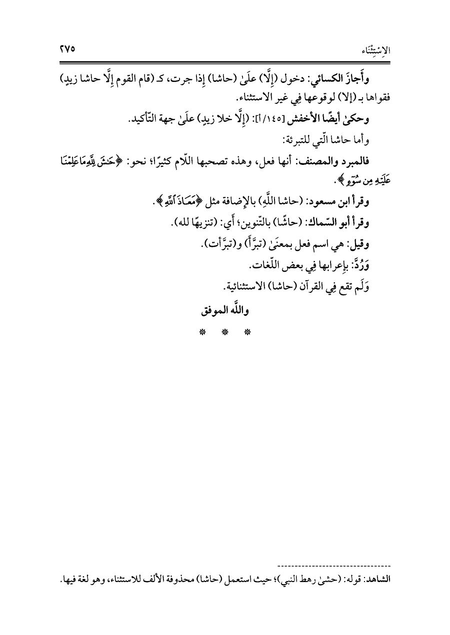 وأَجازَ الكسائي: دخول (إِلَّا) علَى (حاشا) إِذا جرت، كـ (قام القوم إِلَّا حاشا زيدٍ) فقواها بـ (إلا) لوقوعها فِي غير الاستثناء.