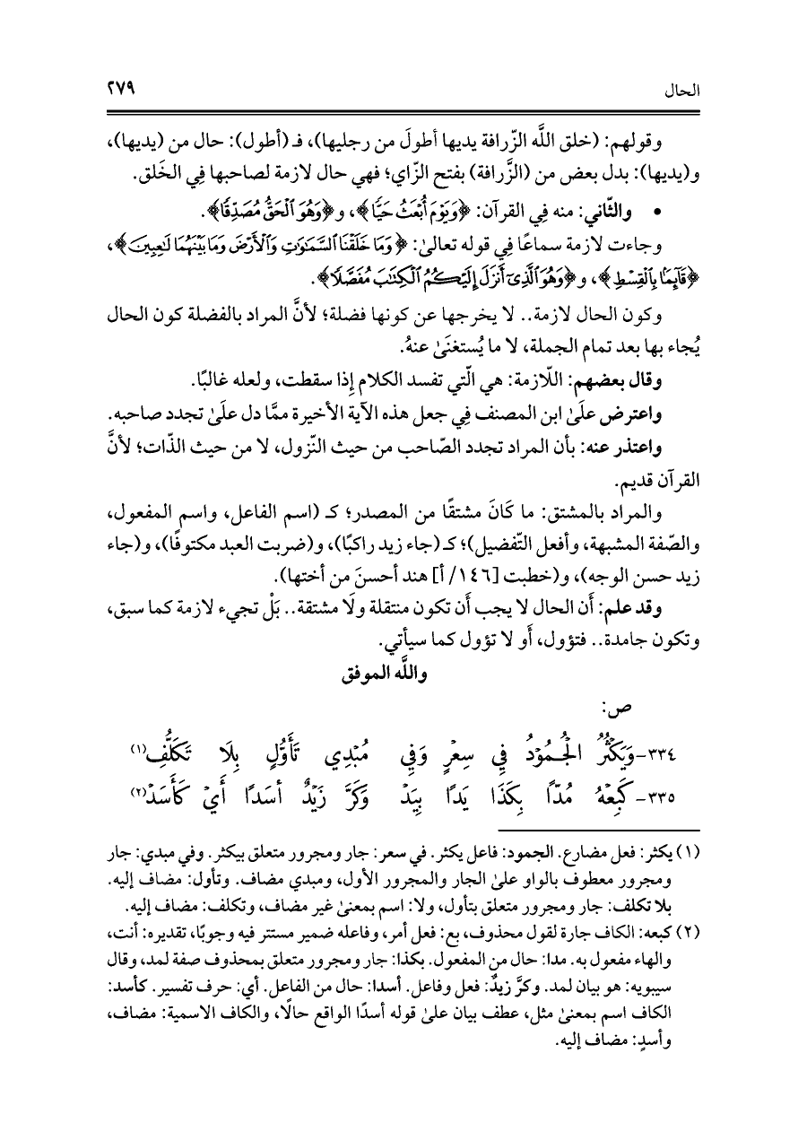 وقد علم: أَن الحال لا يجب أَن تكون منتقلة ولَا مشتقة .. بَلْ تجيء لازمة كما سبق، وتكون جامدة .. فتؤول، أَو لا تؤول كما سيأتي.