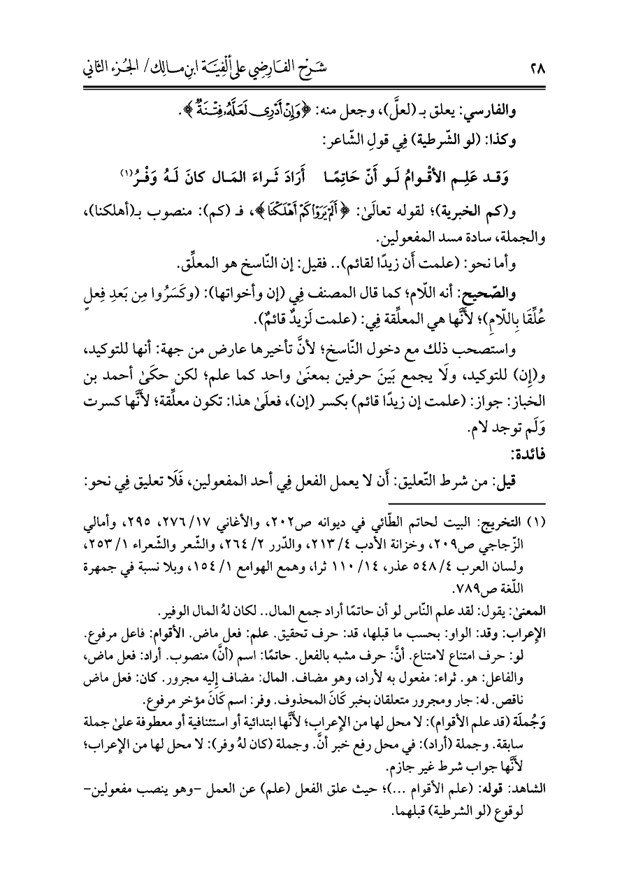 الإِعراب: وقد: الواو: بحسب ما قبلها، قد: حرف تحقيق. علم: فعل ماض. الأقوام: فاعل مرفوع. لو: حرف امتناع لامتناع. أنَّ: حرف مشبه بالفعل. حاتمًا: اسم (أنَّ) منصوب. أراد: فعل ماض، والفاعل: هو. ثراء: مفعول به لأراد، وهو مضاف. المال: مضاف إِليه مجرور. كان: فعل ماض ناقص. له: جار ومجرور متعلقان بخبر كَانَ المحذوف. وفر: اسم كَانَ مؤخر مرفوع.