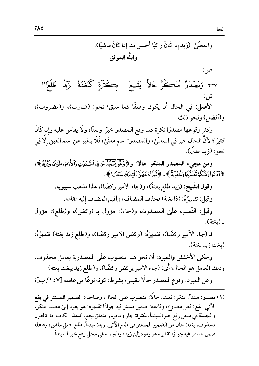 ٣٣٧ - وَمَصْدَرٌ مُنَكَّرٌ حَالًا يَقَعْ ... بِكَثْرَةٍ كَبَغْتَةً زَيْدٌ طَلَعْ (¬١)