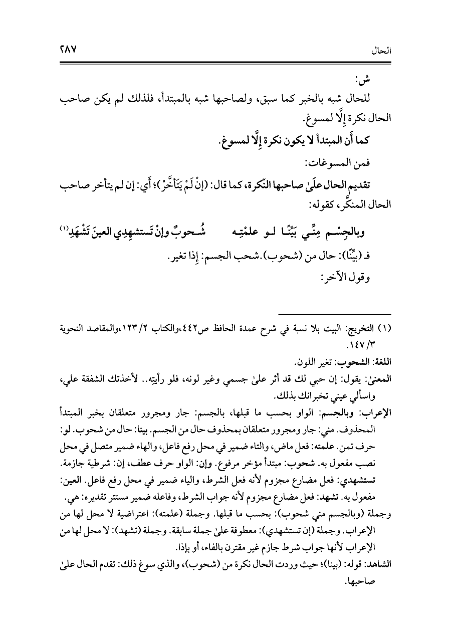 الشاهد: قوله: (بينا)؛ حيث وردت الحال نكرة من (شحوب)، والذي سوغ ذلك: تقدم الحال على صاحبها.