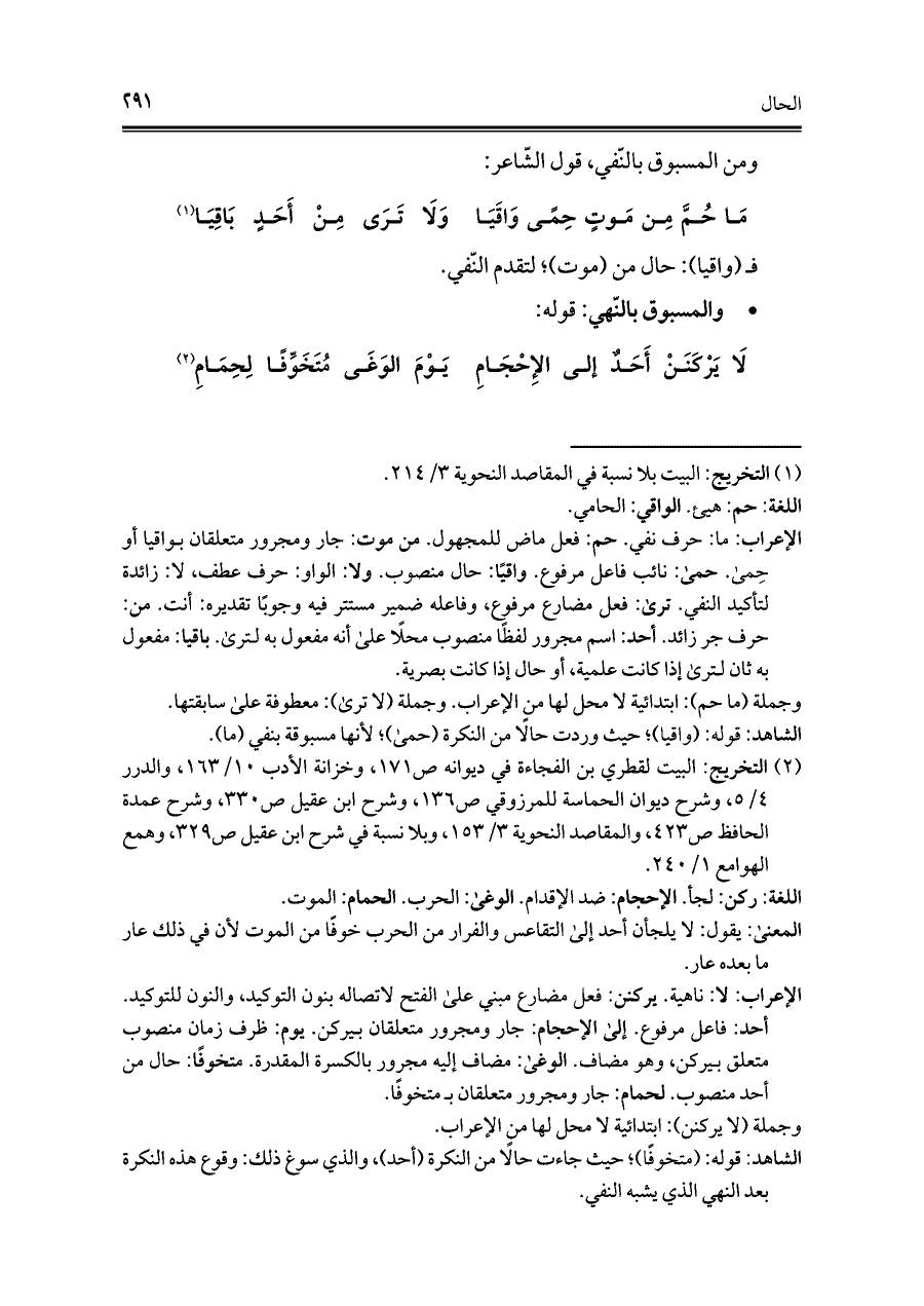 الإعراب: ما: حرف نفي. حم: فعل ماض للمجهول. من موت: جار ومجرور متعلقان بواقيا أو حِمى. حمى: نائب فاعل مرفوع. واقيًا: حال منصوب. ولا: الواو: حرف عطف، لا: زائدة لتأكيد النفي. ترى: فعل مضارع مرفوع، وفاعله ضمير مستتر فيه وجوبًا تقديره: أنت. من: حرف جر زائد. أحد: اسم مجرور لفظًا منصوب محلًّا على أنه مفعول به لترى. باقيا: مفعول به ثان لترى إذا كانت علمية، أو حال إذا كانت بصرية.