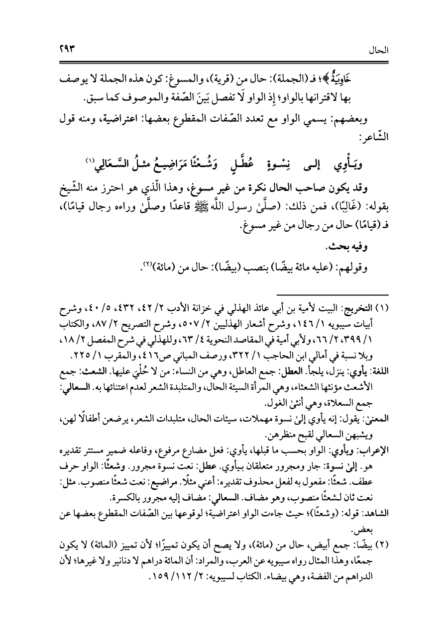 (¬٢) بيضًا: جمع أبيض، حال من (مائة)، ولا يصح أن يكون تمييزًا؛ لأن تمييز (المائة) لا يكون جمعًا، وهذا المثال رواه سيبويه عن العرب، والمراد: أن المائة دراهم لا دنانير ولا غيرها؛ لأن الدراهم من الفضة، وهي بيضاء. الكتاب لسيبويه: ٢/ ١١٢/ ١٥٩.