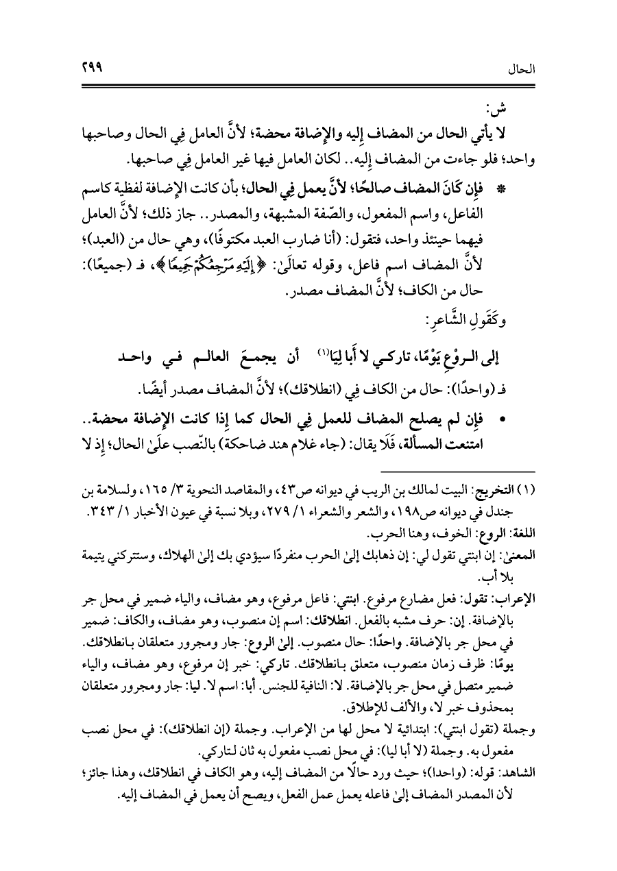 * فإِن كانَ المضاف صالحًا؛ لأنَّ يعمل فِي الحال؛ بأن كانت الإِضافة لفظية كاسم الفاعل، واسم المفعول، والصّفة المشبهة، والمصدر .. جاز ذلك؛ لأنَّ العامل فيهما حينئذ واحد، فتقول: (أنا ضارب العبد مكتوفًا)، وهي حال من (العبد)؛ لأنَّ المضاف اسم فاعل، وقوله تعالَى: {إِلَيْهِ مَرْجِعُكُمْ جَمِيعًا}، فـ (جميعًا): حال من الكاف؛ لأنَّ المضاف مصدر.