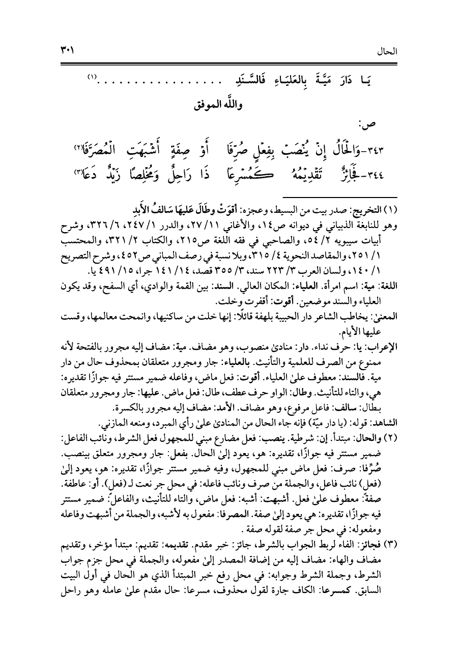 ٣٤٣ - وَالحَالُ إِنْ يُنْصَبْ بِفِعْلٍ صُرِّفَا ... أَوْ صِفَةٍ أَشْبَهَتِ المُصَرَّفَا (¬٢)