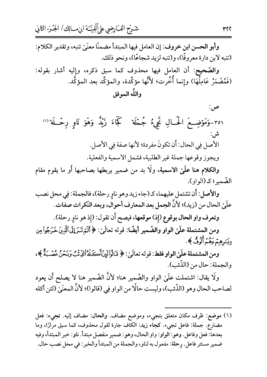 ٣٥١ - وَمَوضِعَ الْحَالِ تَجِيءُ جُمْلَه .... كَجَاءَ زَيْدٌ وَهْوَ نَاوٍ رِحْلَه (¬١)