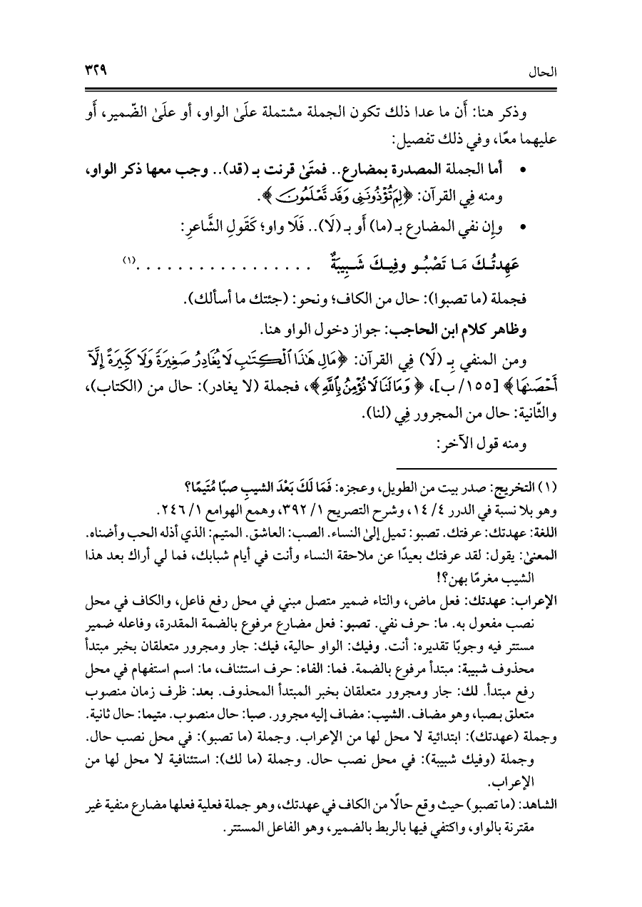 الشاهد: (ما تصبو) حيث وقع حالًا من الكاف في عهدتك، وهو جملة فعلية فعلها مضارع منفية غير مقترنة بالواو، واكتفي فيها بالربط بالضمير، وهو الفاعل المستتر.