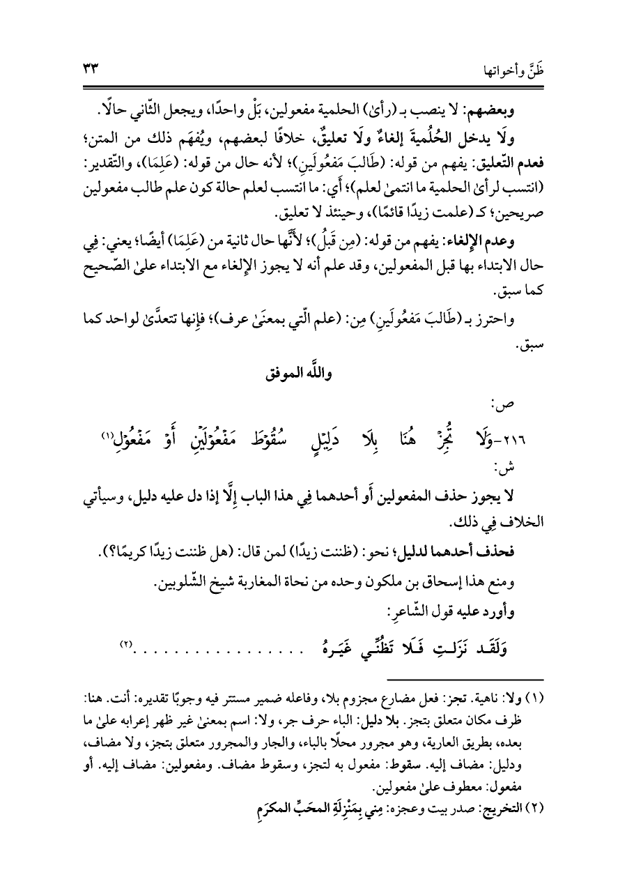 ٢١٦ - وَلَا تُجِزْ هُنَا بِلَا دَلِيْلٍ ... سُقُوْطَ مَفْعُوْلَيْنِ أَوْ مَفْعُوْلِ (¬١)