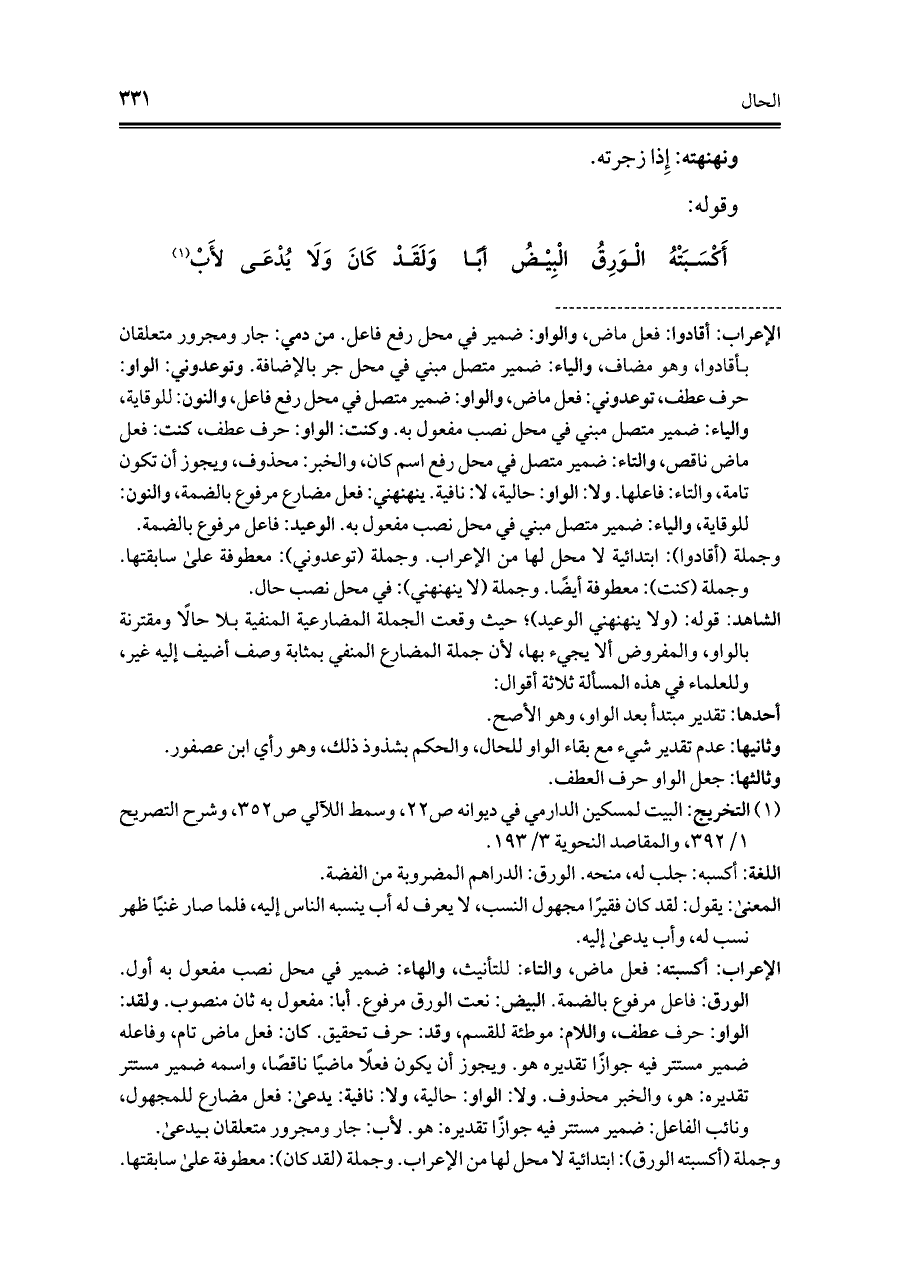 الإعراب: أكسبته: فعل ماض، والتاء: للتأنيث، والهاء: ضمير في محلّ نصب مفعول به أول. الورق: فاعل مرفوع بالضمة. البيض: نعت الورق مرفوع. أبا: مفعول به ثان منصوب. ولقد: الواو: حرف عطف، واللام: موطئة للقسم، وقد: حرف تحقيق. كان: فعل ماض تام، وفاعله ضمير مستتر فيه جوازًا تقديره هو. ويجوز أن يكون فعلًا ماضيًا ناقصًا، واسمه ضمير مستتر تقديره: هو، والخبر محذوف. ولا: الواو: حالية، ولا: نافية: يدعى: فعل مضارع للمجهول، ونائب الفاعل: ضمير مستتر فيه جوازًا تقديره: هو. لأب: جار ومجرور متعلقان بيدعى.