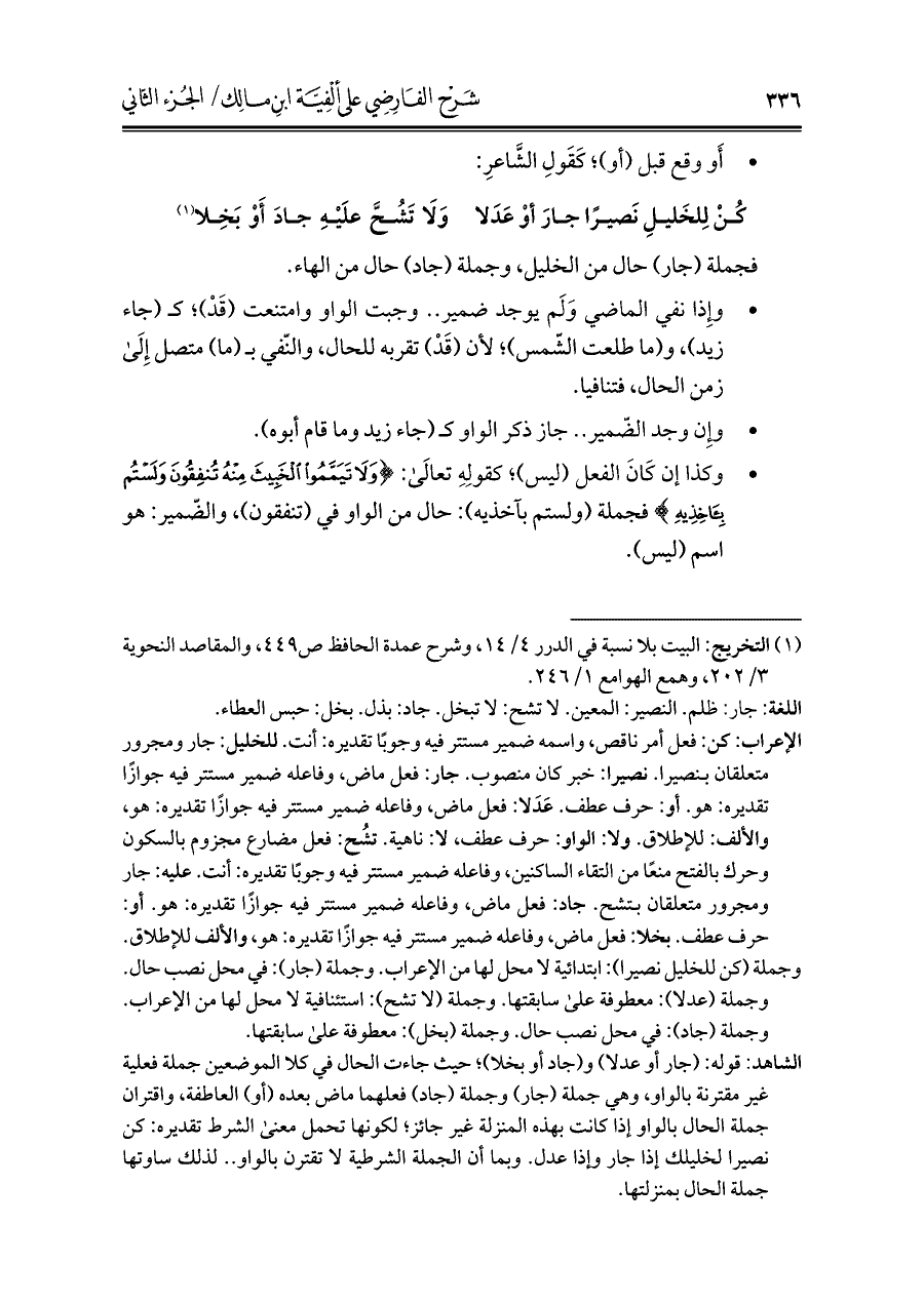 الشاهد: قوله: (جار أو عدلا) و (جاد أو بخلا)؛ حيث جاءت الحال في كلا الموضعين جملة فعلية غير مقترنة بالواو، وهي جملة (جار) وجملة (جاد) فعلهما ماض بعده (أو) العاطفة، واقتران جملة الحال بالواو إذا كانت بهذه المنزلة غير جائز؛ لكونها تحمل معنى الشرط تقديره: كن نصيرا لخليلك إذا جار وإذا عدل. وبما أن الجملة الشرطية لا تقترن بالواو .. لذلك ساوتها جملة الحال بمنزلتها.