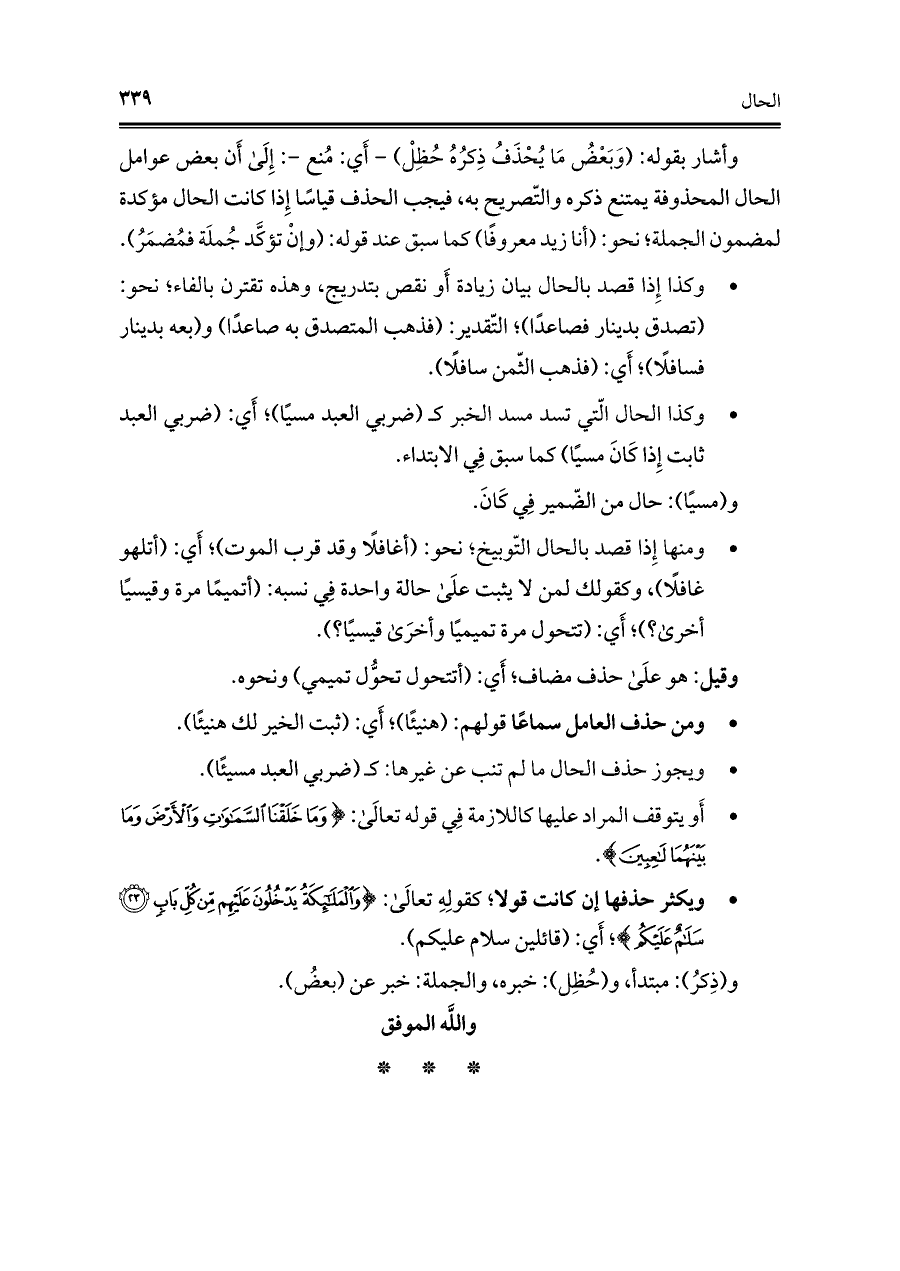 * وكذا الحال التي تسد مسد الخبر كـ (ضربي العبد مسيًا)؛ أي: (ضربي العبد ثابت إذا كَانَ مسيًا) كما سبق في الابتداء.