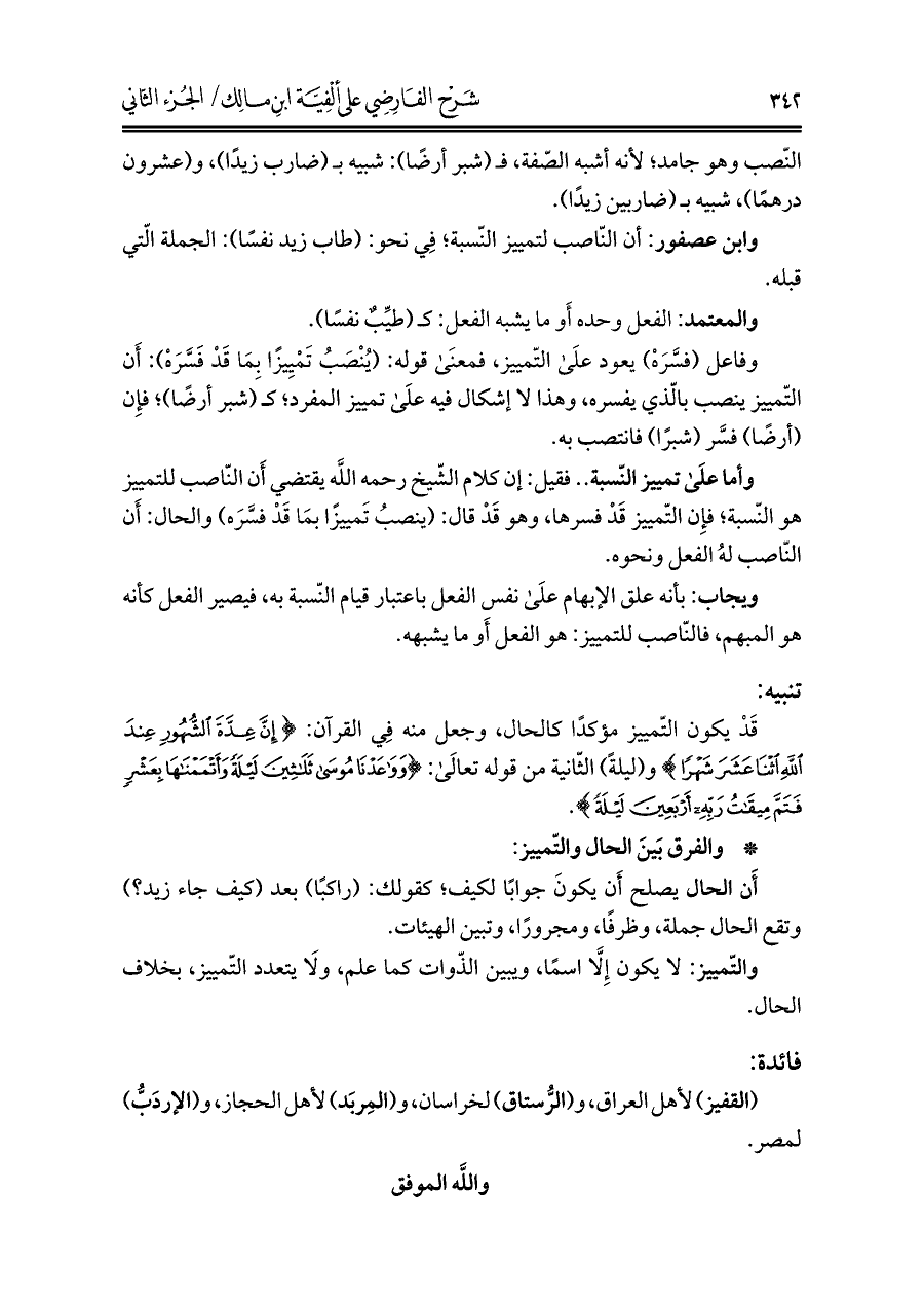 وأما علَى تمييز النّسبة .. فقيل: إن كلام الشّيخ رحمه الله يقتضي أن النَّاصب للتمييز هو النّسبة؛ فإِن التّمييز قد فسرها، وهو قَدْ قال: (ينصبُ تَمييزًا بمَا قَدْ فَسَّرَه) والحال: أَن النَّاصب لهُ الفعل ونحوه.