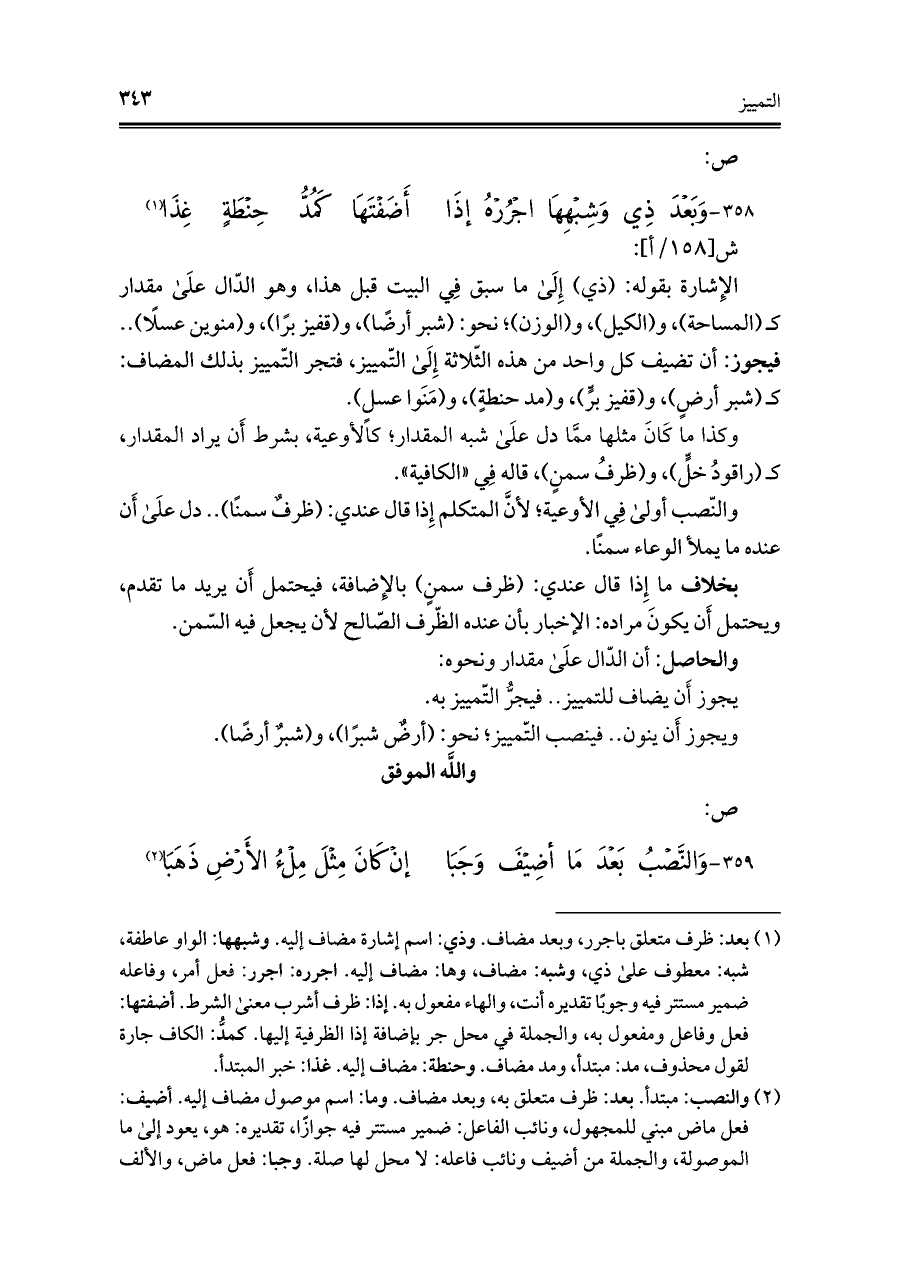 ٣٥٩ - وَالنَّصبُ بَعدَ مَا أضِيفَ وَجَبَا ... إنْ كانَ مِثلَ مِلءُ الأَرْضِ ذَهَبَا (¬٢)