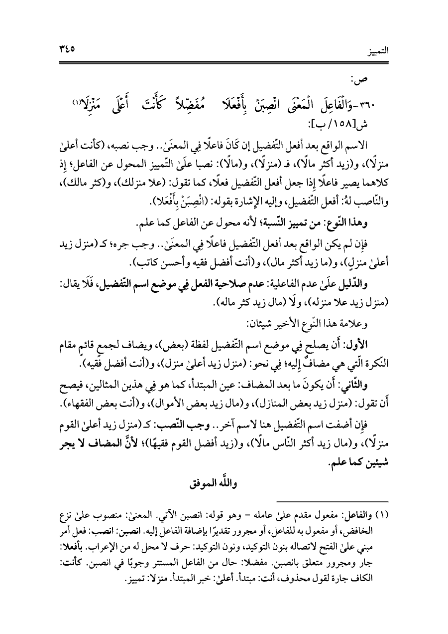 ٣٦٠ - وَالفَاعِلَ المَعنَى انْصِبَنْ بِأَفْعَلَا ... مُفَضِّلًا كَأَنْتَ أَعْلَى مَنْزِلًا (¬١)