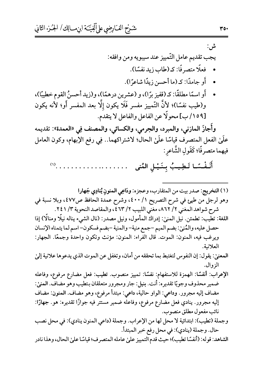 الشاهد: قوله: (أنفسًا تطيب)؛ حيث قدم التّمييز علَى عامله المتصرف؛ قياسًا علَى الحال، وهذا نادر
