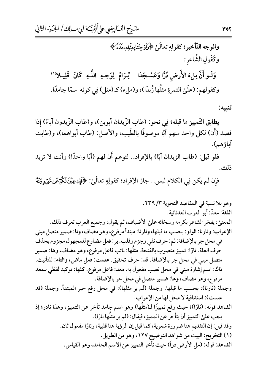 الشاهد: قوله: (مل الأرض درا) حيث تأخر التّمييز عن الاسم الجامد، وهو القياس.