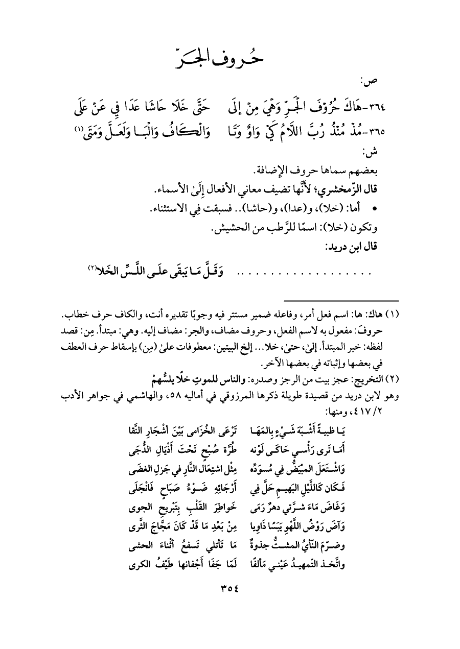 (¬١) هاك: ها: اسم فعل أمر، وفاعله ضمير مستتر فيه وجوبًا تقديره أنت، والكاف حرف خطاب. حروفَ: مفعول به لاسم الفعل، وحروف مضاف، والجر: مضاف إليه. وهي: مبتدأ. مِن: قصد لفظه: خبر المبتدأ. إلى، حتى، خلا ... إلخ البيتين: معطوفات علَى (مِن) بإسقاط حرف العطف في بعضها وإثباته في بعضها الآخر.