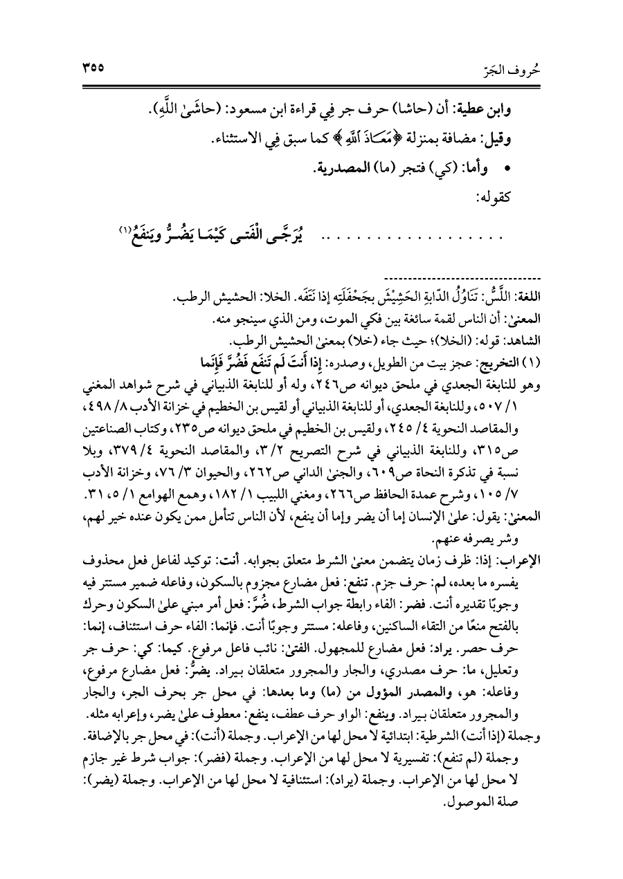 ................ ... يُرَجَّى الْفَتى كَيْمَا يَضُرُّ ويَنفَعُ (¬١)