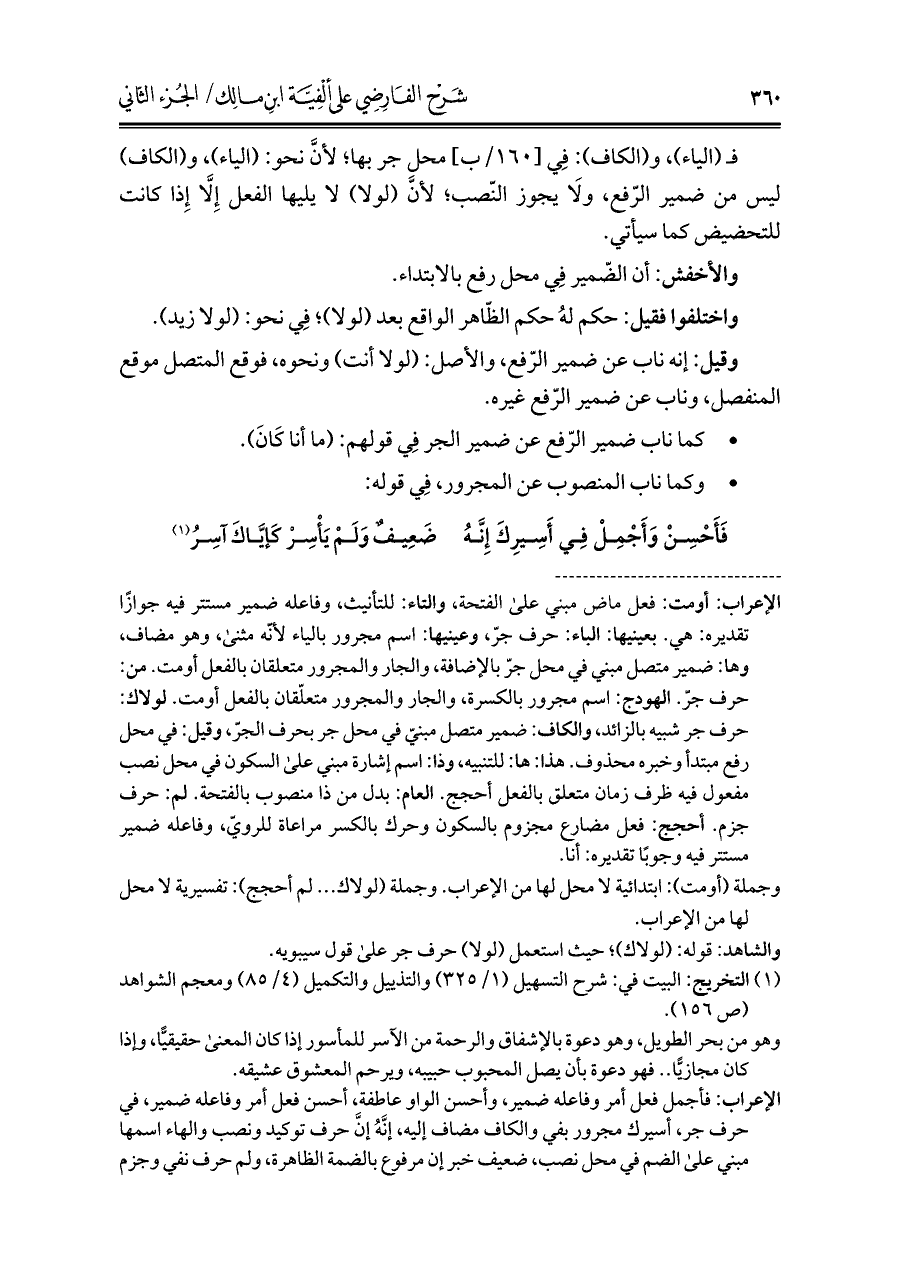 فـ (الياء)، و (الكاف): في محل جرّ بها؛ لأنَّ نحو: (الياء)، و (الكاف) ليس من ضمير الرَّفع، ولا يجوز النَّصب؛ لأنَّ (لولا) لا يليها الفعل إِلَّا إذا كانت للتحضيض كما سيأتي.