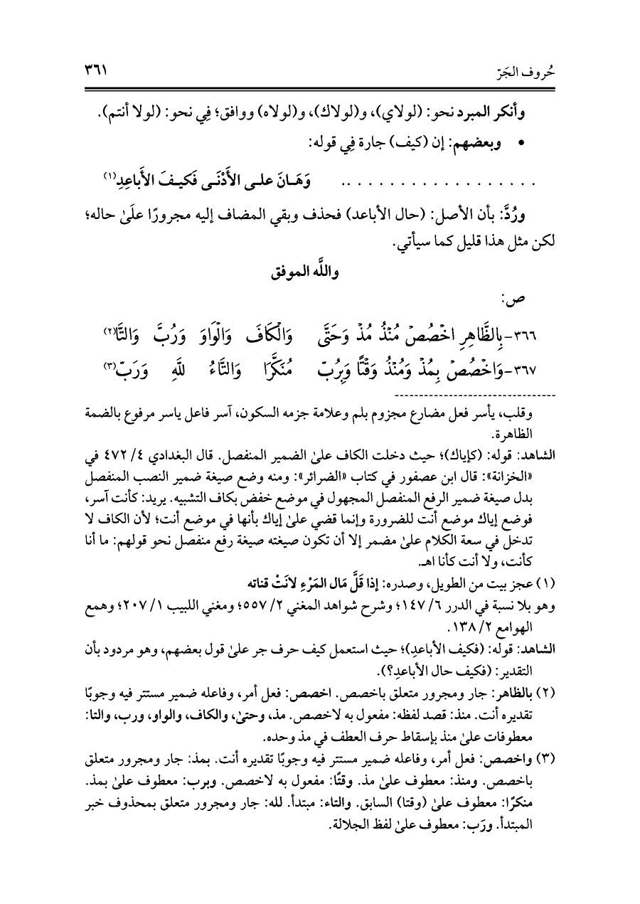 ٣٦٦ - بِالظَّاهِرِ اخصُص مُنذُ مُذ وَحَتَّى ... وَالكَافَ وَالوَاوَ وَرُبَّ وَالتَّا (¬٢)