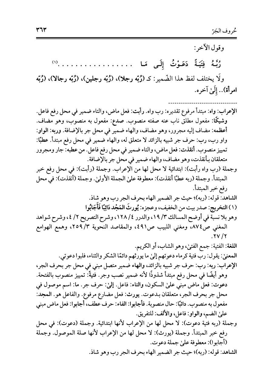 الإعراب: ربه: رب: حرف جرّ شبيه بالزائد، والهاء ضمير متصل مبني في محل جرّ بحرف الجر، وهو أيضًا في محل رفع مبتدأ شذوذًا لأنه ضمر نصب وجر. فتيةً: تمييز منصوب بالفتحة. دعوت: فعل ماض مبني على السكون، والتاء: فاعل. إلى: حرف جرّ. ما: اسم موصول في محل جرّ بحرف الجر، متعلقان بدعوت. يورث: فعل مضارع مرفوع. والفاعل هو. المجد: مفعول به منصوب. دائبًا: حال منصوبة. فأجابوا: الفاء: حرف عطف، أجابوا: فعل ماض مبني على الضم، والواو: فاعل، والألف: للتفريق.