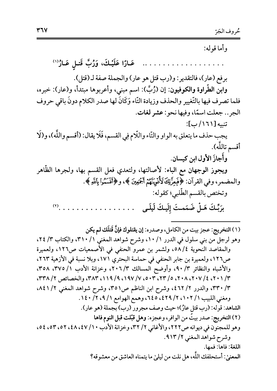 ويجوز الوجهان مع الباء: لأصالتها، ولتعدي فعل القسم بها، ولجرها الظّاهر والمضمر، وفي القرآن: {قَالَ فَبِعِزَّتِكَ لَأُغْوِيَنَّهُمْ أَجْمَعِينَ}، {وَأَقْسَمُوا بِاللَّهِ}.