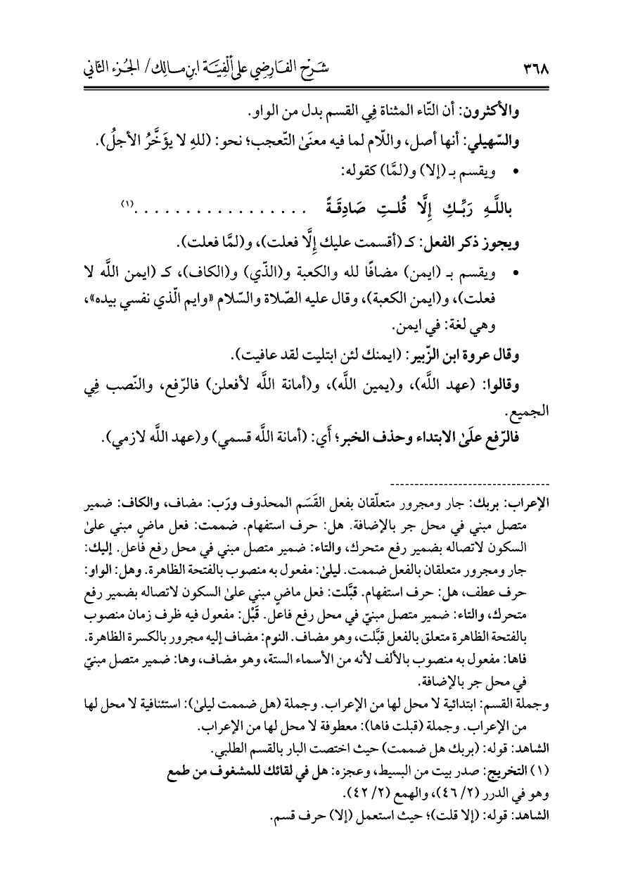 الإعراب: بربك: جار ومجرور متعلقان بفعل القسم المحذوف ورَب: مضاف، والكاف: ضمير متصل مبني في محل جرّ بالإضافة. هل: حرف استفهام. ضممت: فعل ماضٍ مبني على السكون لاتصاله بضمير رفع متحرك، والتاء: ضمير متصل مبني في محل رفع فاعل. إليك: جار ومجرور متعلقان بالفعل ضممت. ليلى: مفعول به منصوب بالفتحة الظاهرة. وهل: الواو: حرف عطف، هل: حرف استفهام. قلت: فعل ماض مبني على السكون لاتصاله بضمير رفع متحرك، والتاء: ضمير متصل مبني في محل رفع فاعل. قبل: مفعول فيه ظرف زمان منصوب بالفتحة الظاهرة متعلق بالفعل قبَّلت، وهو مضاف. النوم: مضاف إليه مجرور بالكسرة الظاهرة. فاها: مفعول به منصوب بالألف لأنه من الأسماء الستة، وهو مضاف، وها: ضمير متصل مبنيّ في محل جرّ بالإضافة.