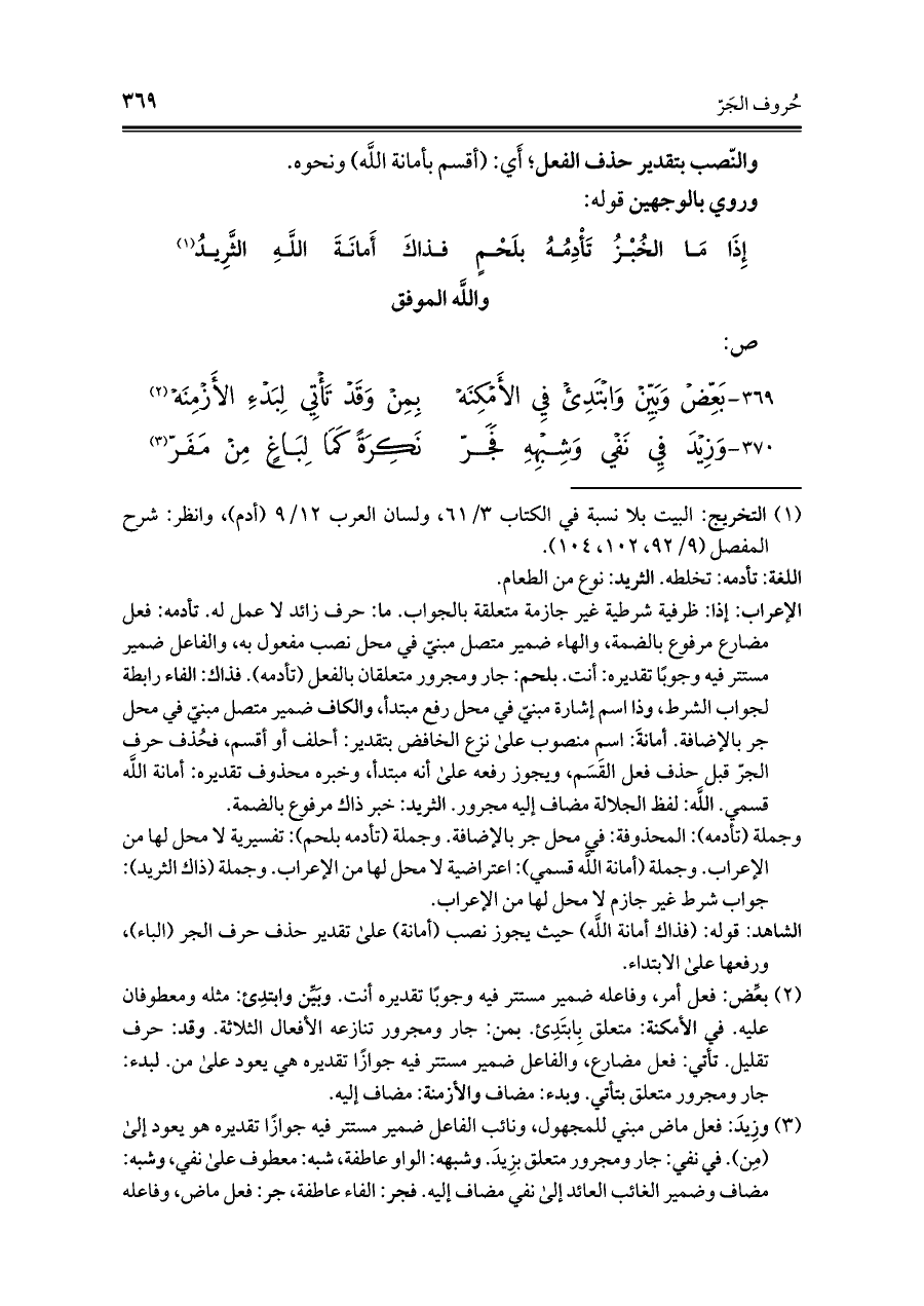 (¬٣) وزِيدَ: فعل ماض مبني للمجهول، ونائب الفاعل ضمير مستتر فيه جوازًا تقديره هو يعود إلى (مِن). في نفي: جار ومجرور متعلق بزِيدَ. وشبهه: الواو عاطفة، شبه: معطوف على نفي، وشبه: مضاف وضمير الغائب العائد إلى نفي مضاف إليه. فجر: الفاء عاطفة، جرّ: فعل ماض، وفاعله