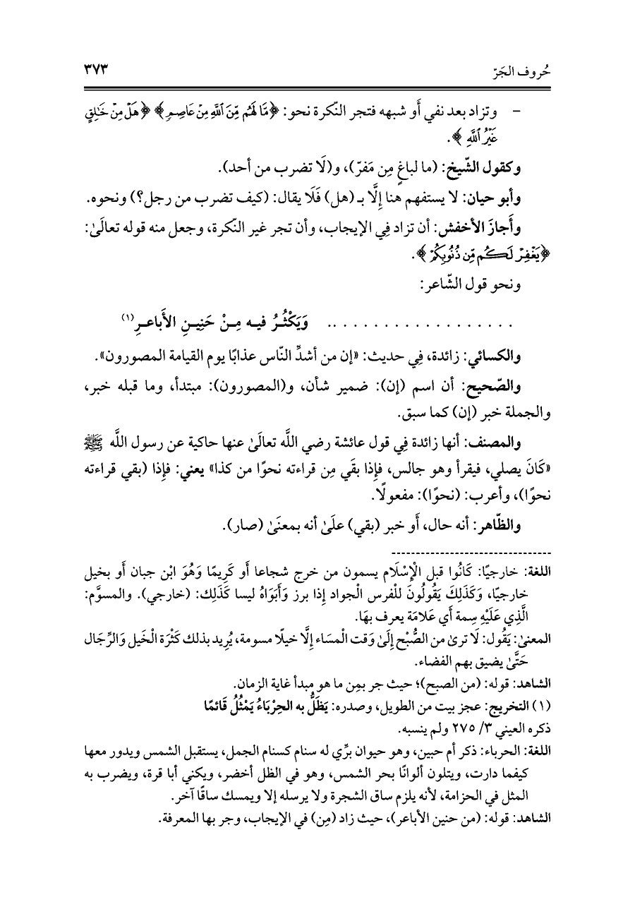 الشاهد: قوله: (من حنين الأباعر)، حيث زاد (مِن) في الإيجاب، وجر بها المعرفة.