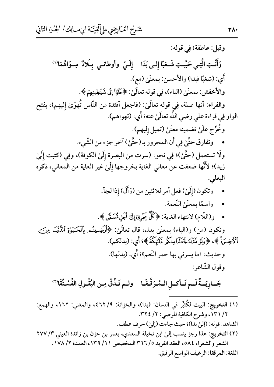 الشاهد: قوله: (إلى بدا)؛ حيث جاءت (إلى) حرف عطف.
