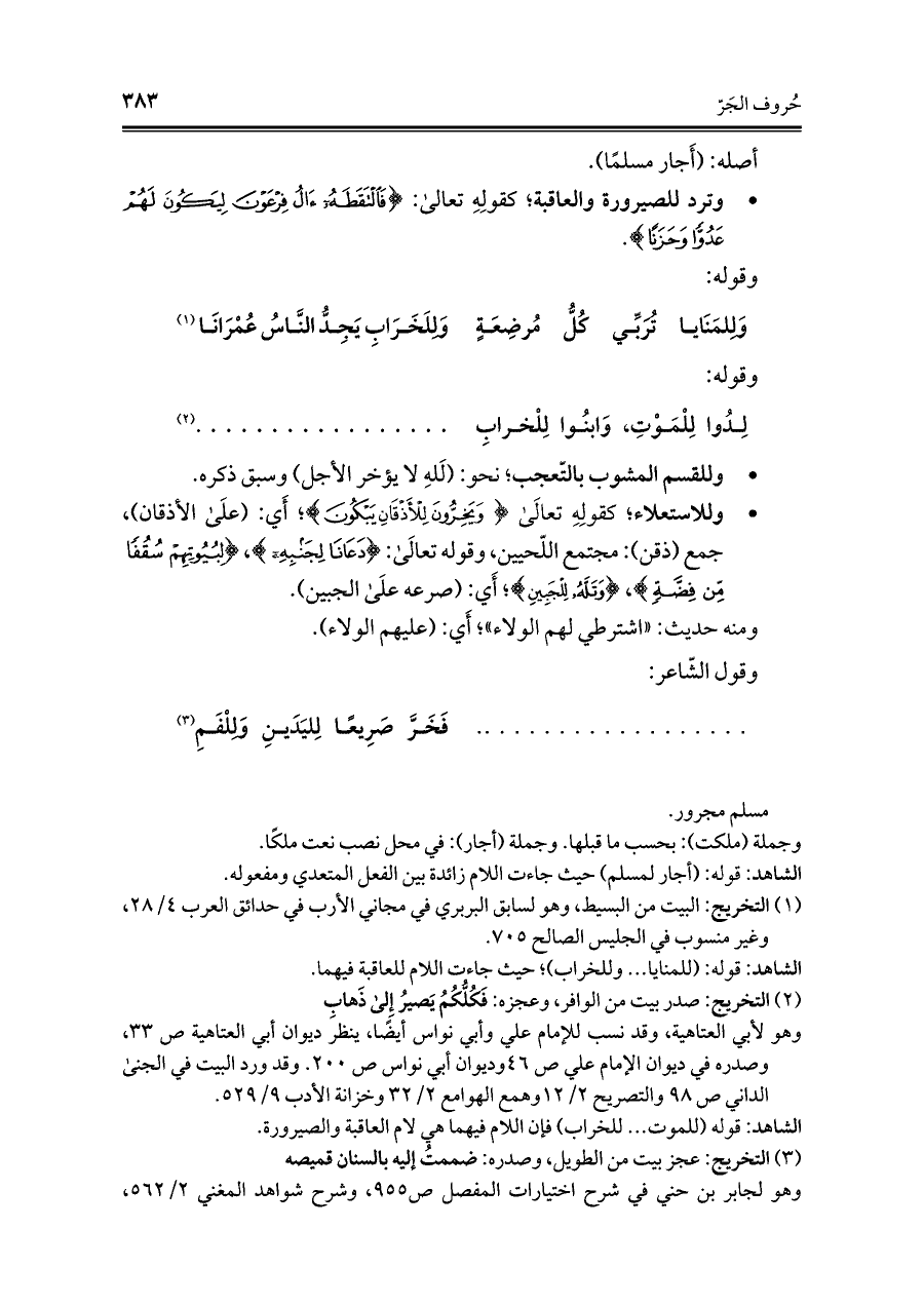 الشاهد: قوله: (أجار لمسلم) حيث جاءت اللام زائدة بين الفعل المتعدي ومفعوله.