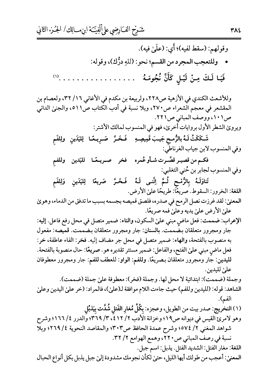 الإعراب: ضممت: فعل ماضٍ مبني على السكون، والتاء: ضمير متصل في محل رفع فاعل. إليه: جار ومجرور متعلقان بضممت. بالسنان: جار ومجرور متعلقان بضممت. قميصه: مفعول به منصوب بالفتحة، والهاء: ضمير متصل في محل جرّ مضاف إليه. فخر: الفاء عاطفة، خر: فعل ماضٍ مبني على الفتح، والفاعل: ضمير مستتر تقديره هو. صريعًا: حال منصوبة بالفتحة. لليدين: جار ومجروو متعلقان بصريعًا. وللفم: الواو: للعطف للفم: جار ومجرور معطوفان على لليدين.