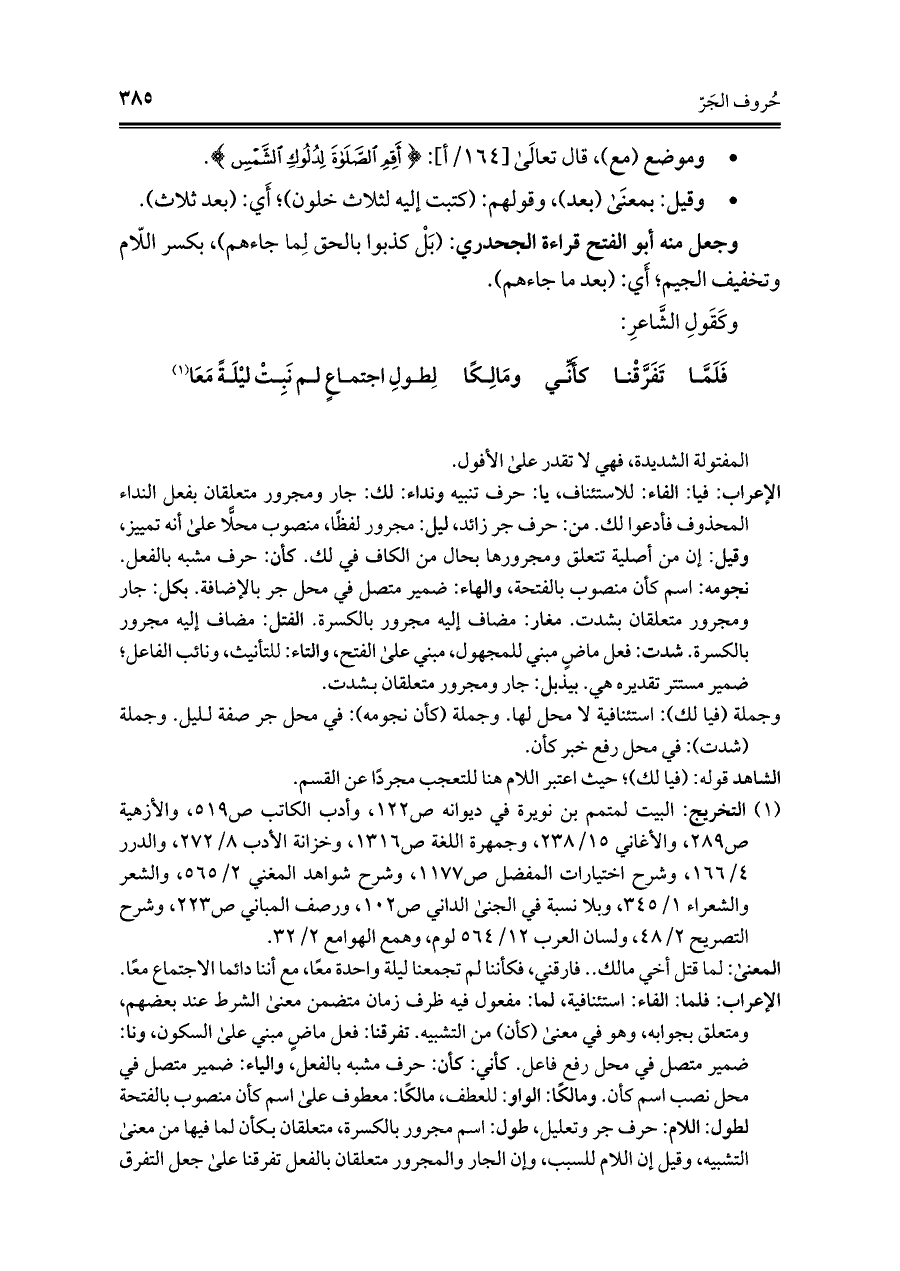 الإعراب: فلما: الفاء: استئنافية، لما: مفعول فيه ظرف زمان متضمن معنى الشرط عند بعضهم، ومتعلق بجوابه، وهو في معنى (كأن) من التشبيه. تفرقنا: فعل ماض مبني على السكون، ونا: ضمير متصل في محل رفع فاعل. كأني: كأن: حرف مشبه بالفعل، والياء: ضمير متصل في محل نصب اسم كأن. ومالكًا: الواو: للعطف، مالكًا: معطوف على اسم كأن منصوب بالفتحة الطول: اللام: حرف جرّ وتعليل، طول: اسم مجرور بالكسرة، متعلقان بكأن لما فيها من معنى التشبيه، وقيل إن اللام للسبب، وإن الجار والمجرور متعلقان بالفعل تفرقنا على جعل التفرق