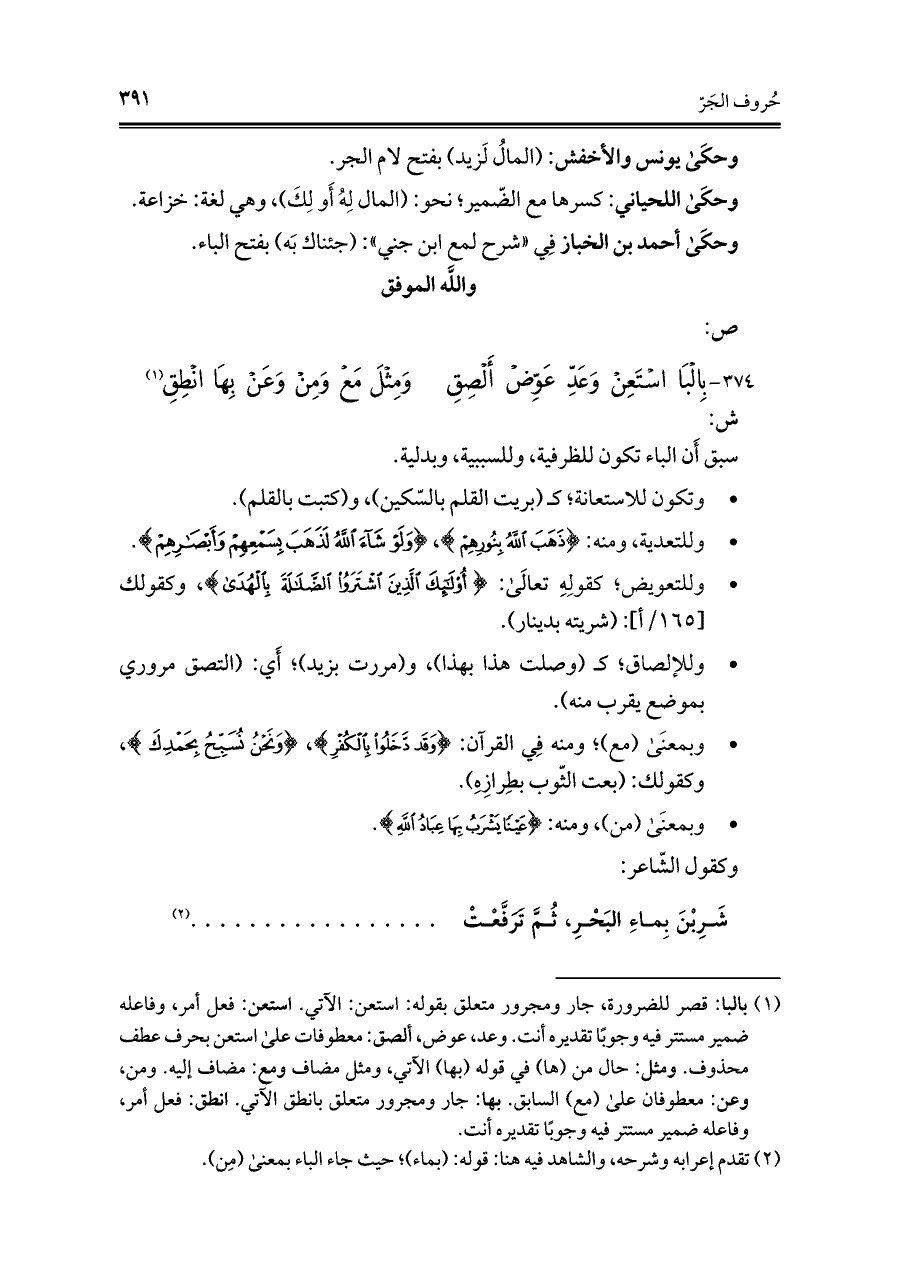 ٣٧٤ - بِالبَا استَعِن وَعدِّ عَوِّض أَلْصِقِ ... ومِثلَ مَع وَمِنْ وَعَنْ بِهَا انْطِقِ (¬١)