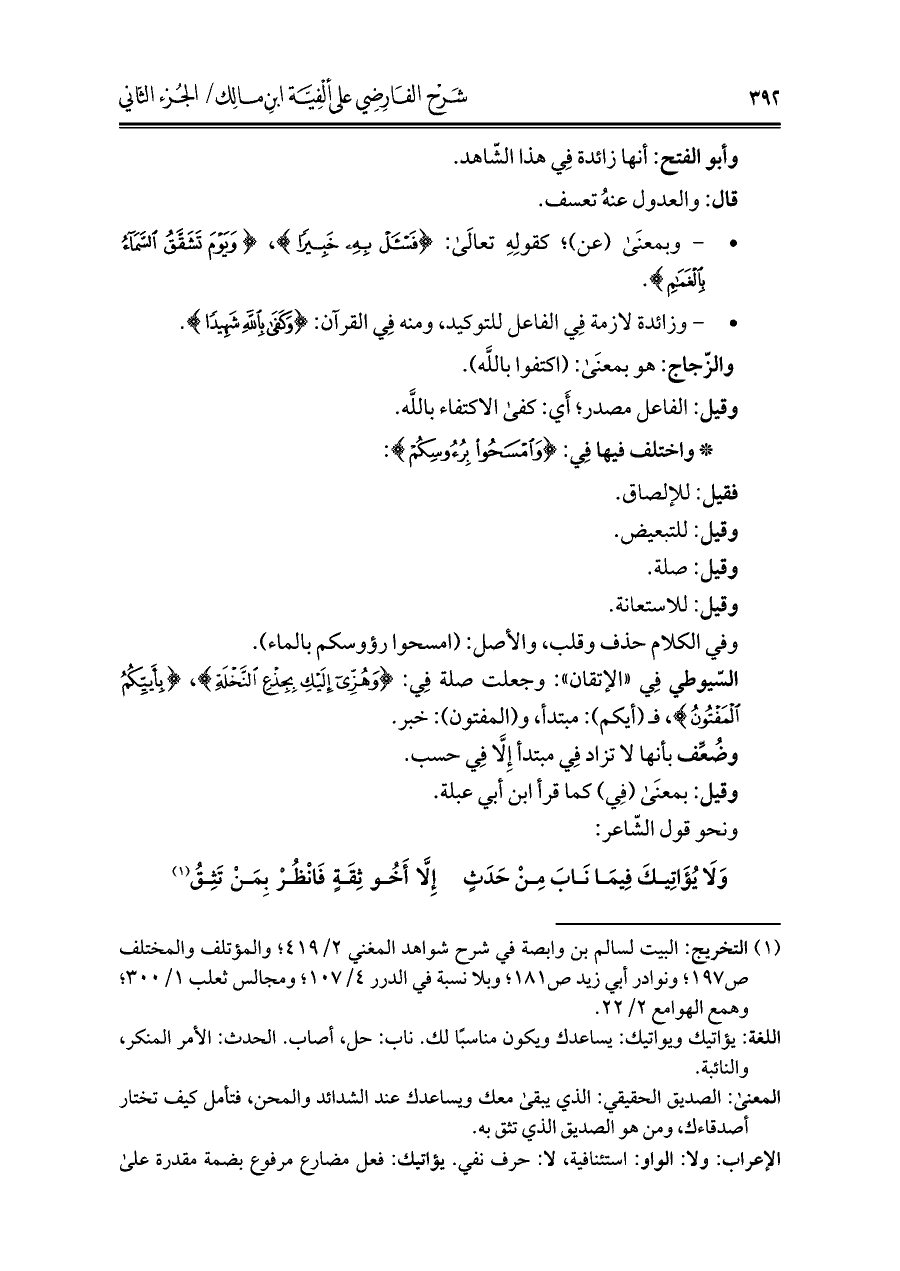 * وبمعنى (عن)؛ كقولِهِ تعالى: {فَاسْأَلْ بِهِ خَبِيرًا}، {وَيَوْمَ تَشَقَّقُ السَّمَاءُ بِالْغَمَامِ}