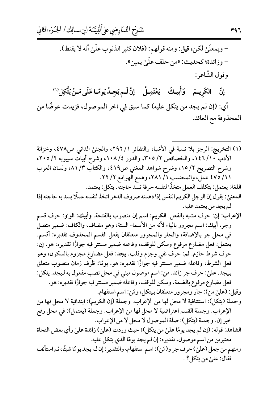الشّاهد: قوله: (إن لم يجد يوما على من يتكل)؛ حيث وردت (على) زائدة على رأي بعض النحاة معتبرين من اسم موصول، تقديره: إن لم يجد يومًا الذي يتكل عليه.