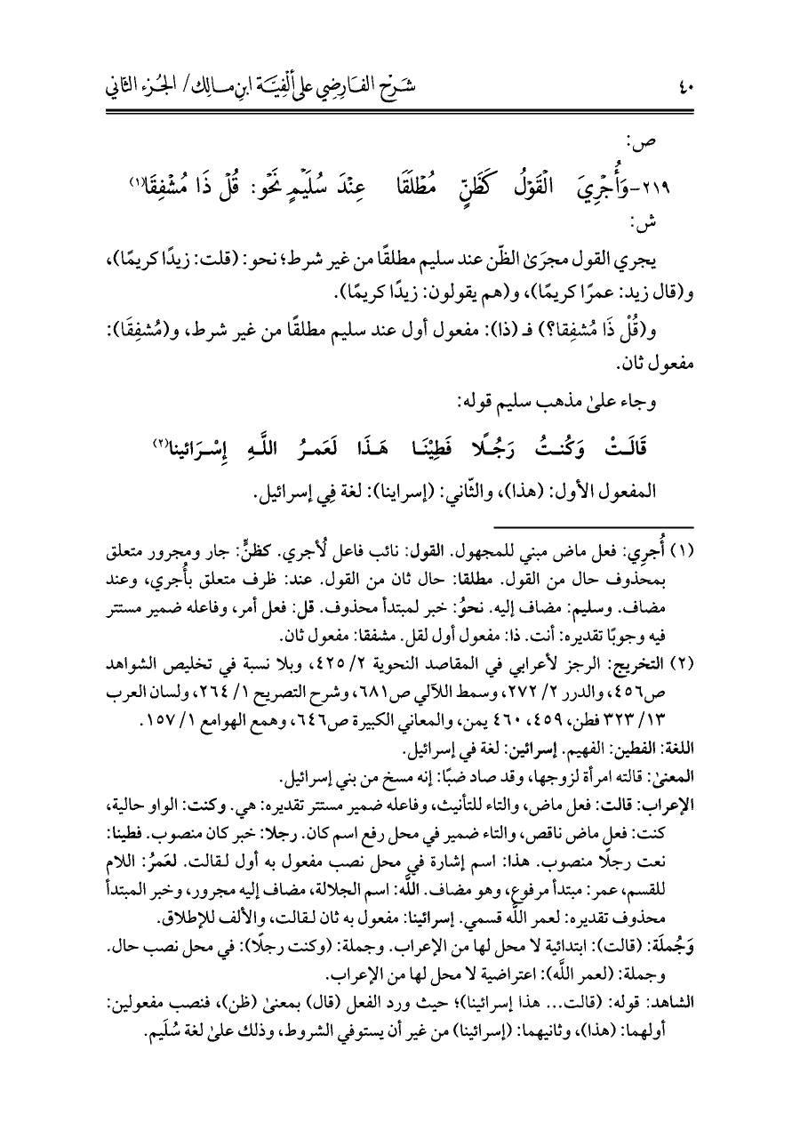٢١٩ - وَأُجْرِيَ الْقَوْلُ كَظَنٍّ مُطْلَقَا ... عِنْدَ سُلَيْمٍ نَحْو: قُلْ ذَا مُشْفِقَا (¬١)