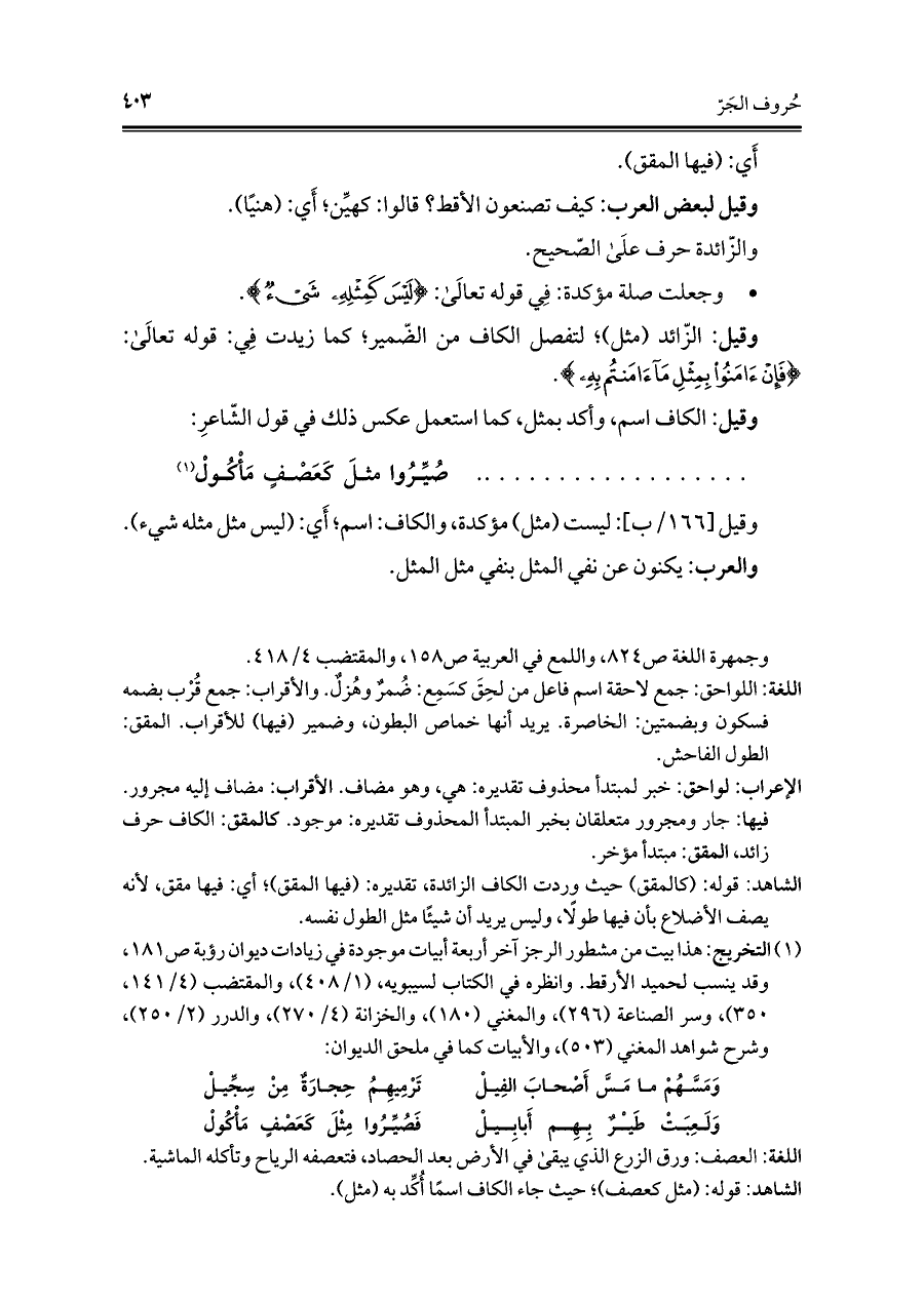 الشّاهد: قوله: (مثل كعصف)؛ حيث جاء الكاف اسمًا أُكِّد به (مثل).