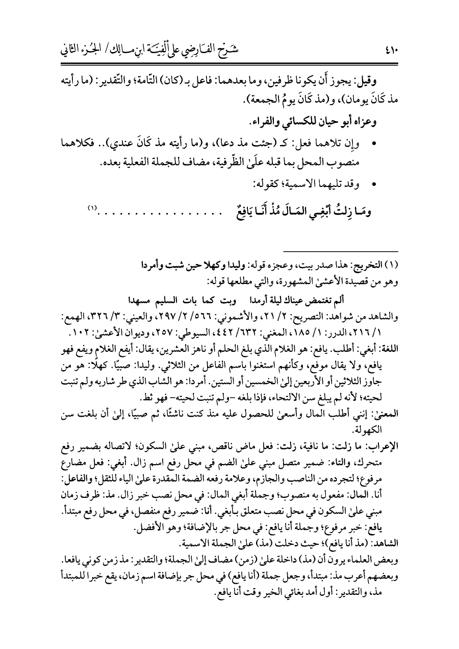 الإعراب: ما زلت: ما نافية، زلت: فعل ماض ناقص، مبني على السكون؛ لاتصاله بضمير رفع متحرك، والتاء: ضمير متصل مبني على الضم في محل رفع اسم زال. أبغي: فعل مضارع مرفوع؛ لتجرده من الناصب والجازم، وعلامة رفعه الضمة المقدرة على الياء للثقل؛ والفاعل: أنا. المال: مفعول به منصوب؛ وجملة أبغي المال: في محل نصب خبر زال. مذ: ظرف زمان مبني على السكون في محل نصب متعلق بأبغي. أنا: ضمير رفع منفصل، في محل رفع مبتدأ. يافع: خبر مرفوع؛ وجملة أنا يافع: في محل جرّ بالإضافة؛ وهو الأفضل.
