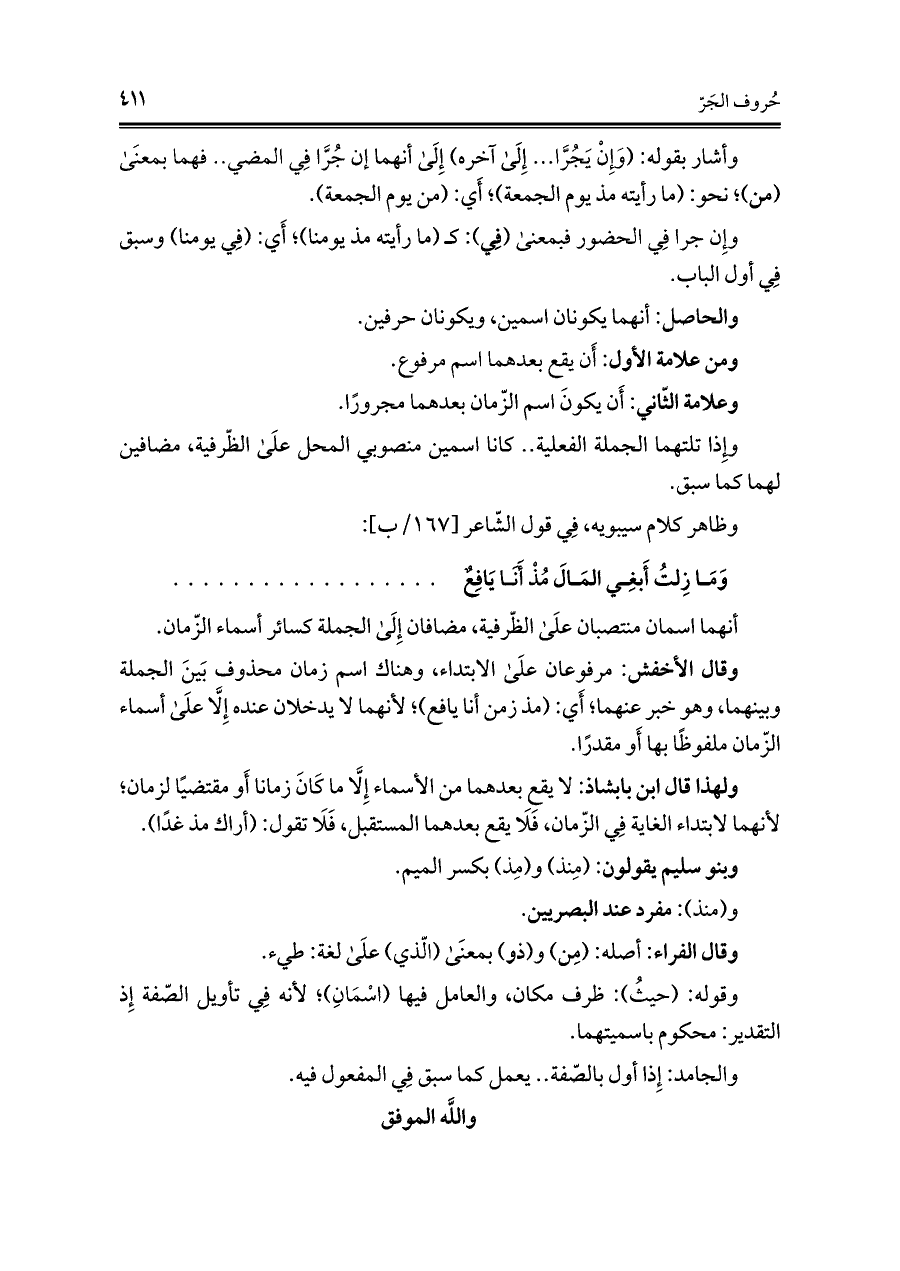 وأشار بقوله: (وَإِنْ يَجُرَّا ... إِلَى آخره) إِلَى أنهما إن جُرَّا في المضي .. فهما بمعنَى (من)؛ نحو: (ما رأيته مذ يوم الجمعة)؛ أَي: (من يوم الجمعة).