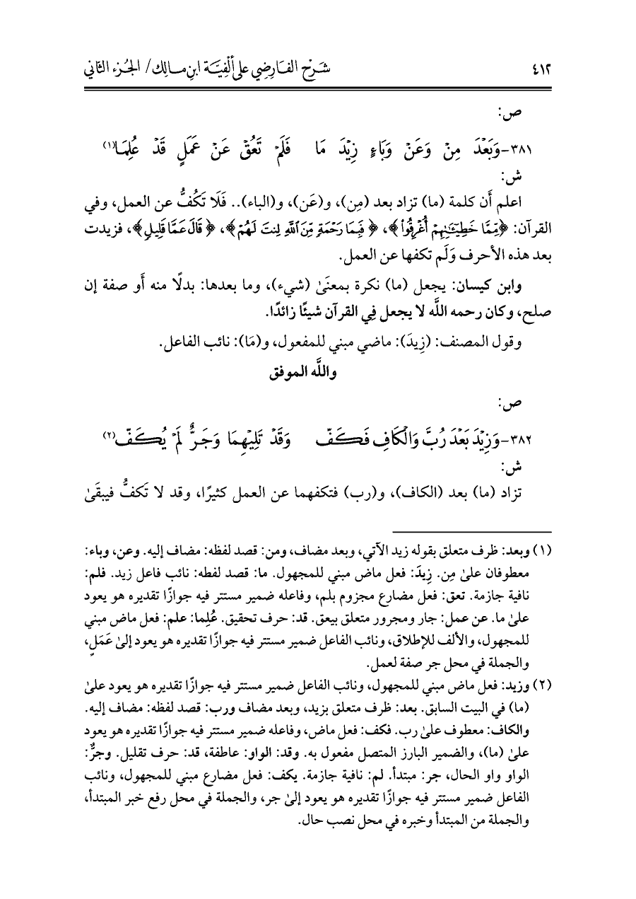 (¬٢) وزيد: فعل ماض مبني للمجهول، ونائب الفاعل ضمير مستتر فيه جوازًا تقديره هو يعود على (ما) في البيت السابق. بعد: ظرف متعلق بزيد، وبعد مضاف ورب: قصد لفظه: مضاف إليه. والكاف: معطوف على رب. فكف: فعل ماض، وفاعله ضمير مستتر فيه جوازًا تقديره هو يعود على (ما)، والضمير البارز المتصل مفعول به. وقد: الواو: عاطفة، قد: حرف تقليل. وجرٌّ: الواو واو الحال، جر: مبتدأ. لم: نافية جازمة. يكف: فعل مضارع مبني للمجهول، ونائب الفاعل ضمير مستتر فيه جوازًا تقديره هو يعود إلى جر، والجملة في محل رفع خبر المبتدأ، والجملة من المبتدأ وخبره في محل نصب حال.